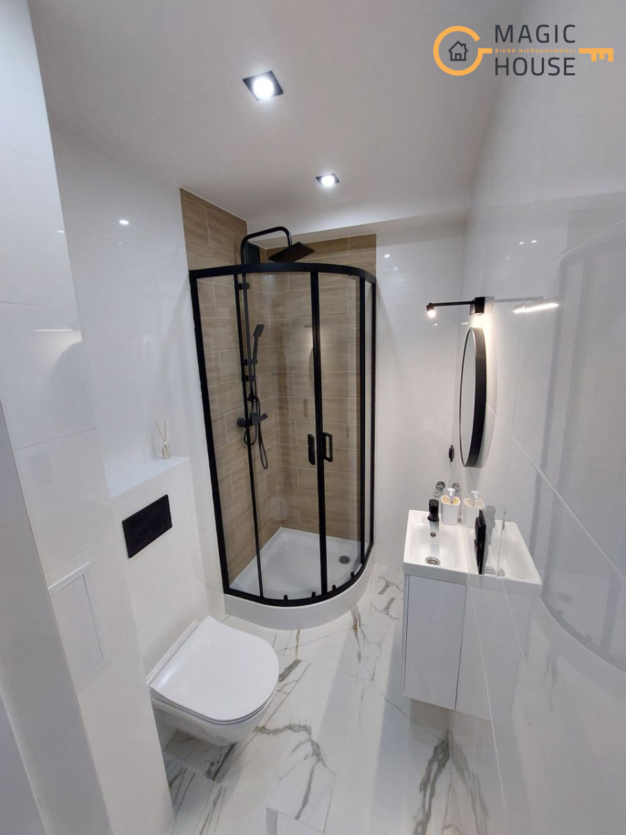 Mieszkanie zostało kompleksowo wyremontowane z wykorzystaniem nowoczesnych materiałów i rozwiązań. Zakres prac obejmował zarówno instalacje, jak i wykończenie wnętrz.