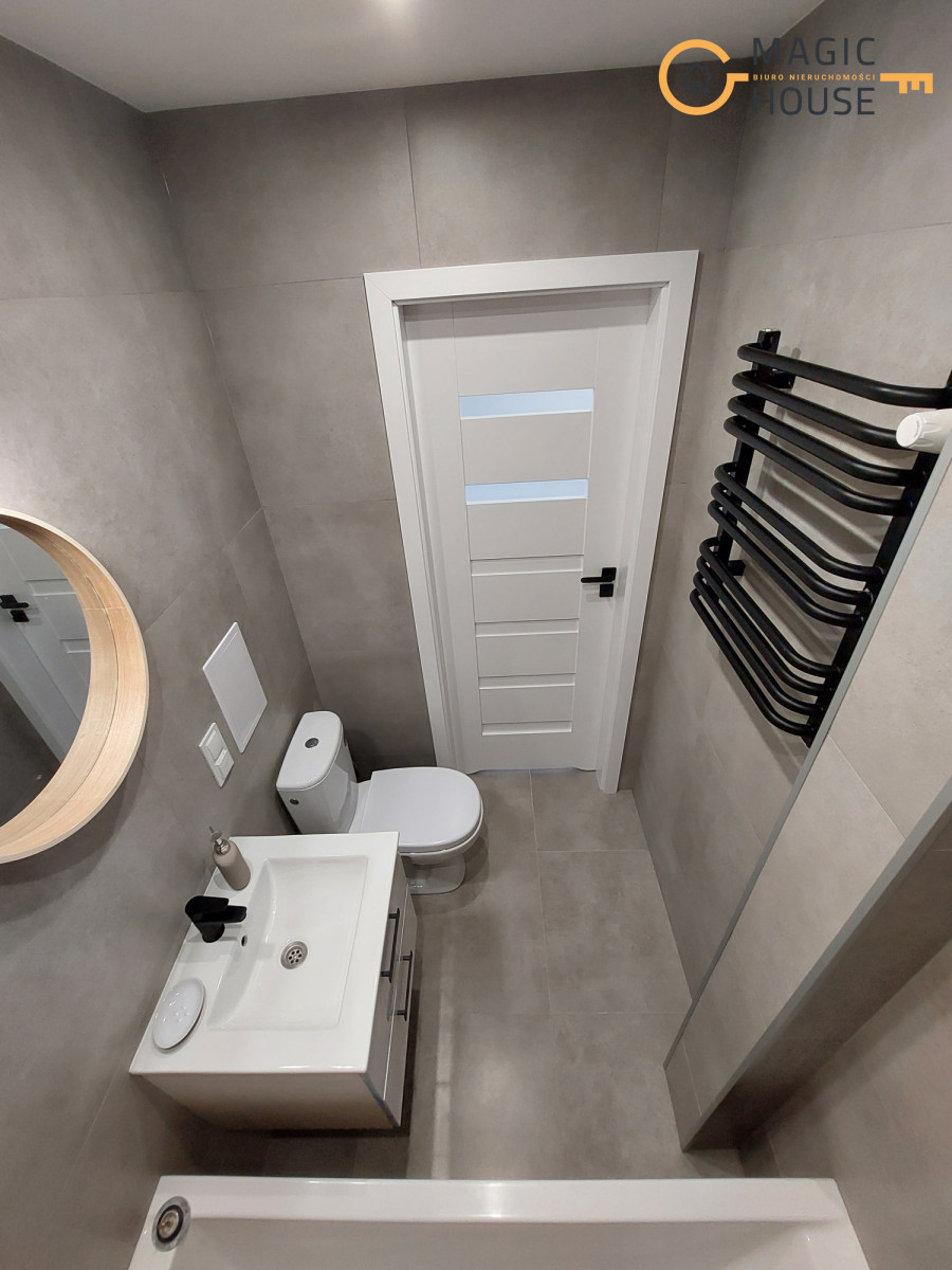 – łazienka: na ścianach i podłodze nowe płytki, urządzenia sanitarne również nowe: umywalka z szafką podwieszaną z dwoma szufladami i baterią oraz prysznic z baterią prysznicową,