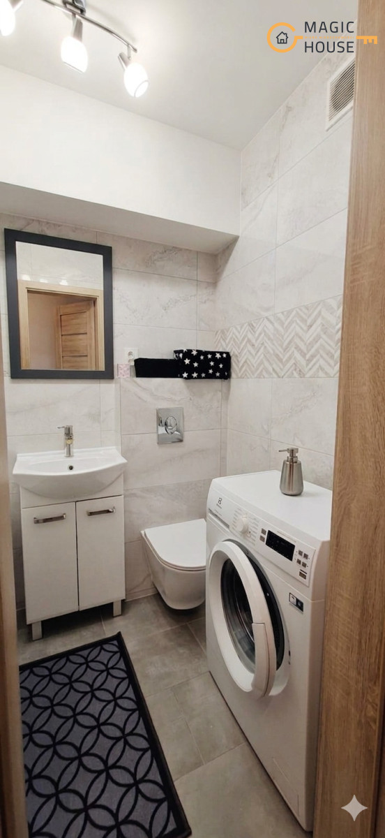 – Łazienka: Nowoczesna, wykończona w wysokim standardzie; pralka