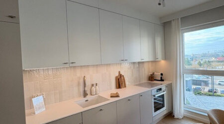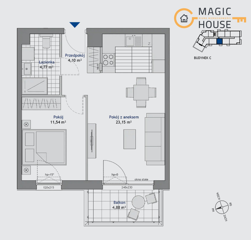 Dwupokojowe mieszkanie o powierzchni 43,56 m² położone jest na piątym piętrze i oferuje zachodnią ekspozycję, która zapewnia naturalne światło w drugiej części dnia. Pokój dzienny z aneksem kuchennym (23,15 m²) to centralna przestrzeń codziennego życia, a wyjście na balkon (4,88 m²) pozwala cieszyć się świeżym powietrzem i chwilą relaksu po pracy.