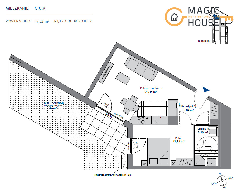 Dwupokojowe mieszkanie o powierzchni 47,23 m², położone na parterze, zostało zaprojektowane z myślą o wygodzie użytkowników na każdym etapie życia. Pokój dzienny z aneksem kuchennym (23,45 m²) posiada bezpośrednie wyjście do ogródka o powierzchni aż 32 m² – to przestrzeń, która daje wiele możliwości aranżacyjnych, zarówno wypoczynkowych, jak i użytkowych.