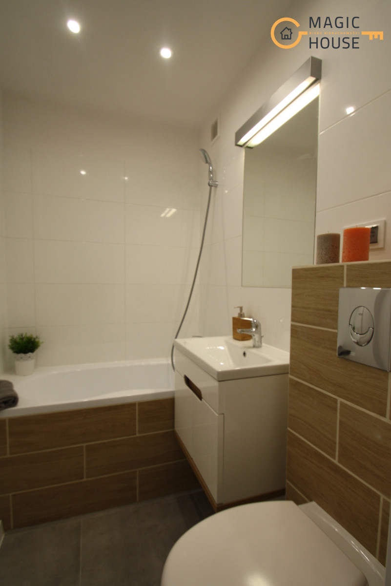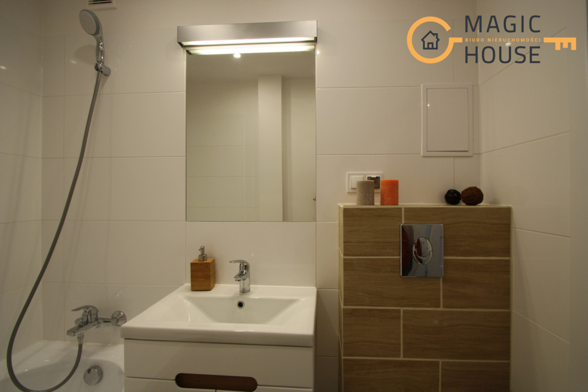 – Łazienka – nowe płytki, armatura sanitarna, kabina prysznicowa z baterią prysznicową, umywalka z szafką, geberit,
