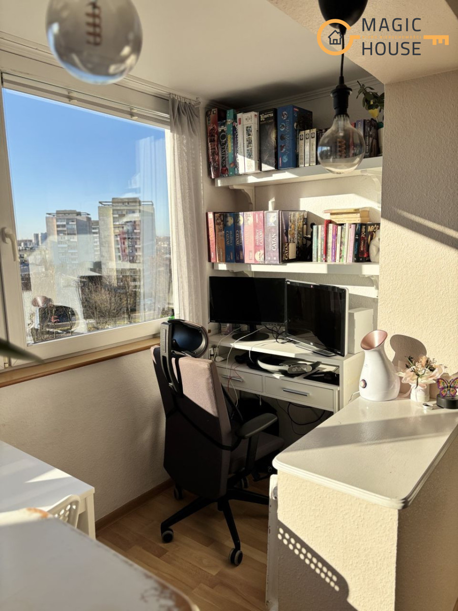 -przestronny salon z wyjściem na loggię (ok. 22 m² łącznie), w którym wydzielono część jadalnianą oraz dwie strefy do pracy,