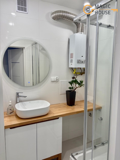 • Łazienka z kabiną prysznicową, pralką i umywalką