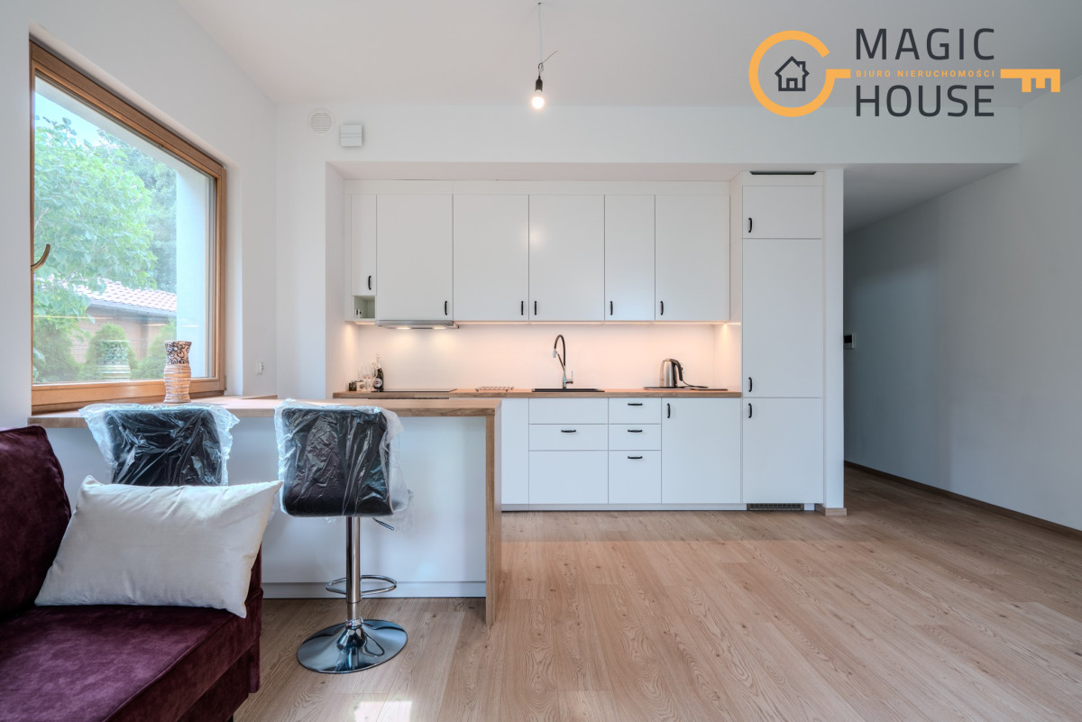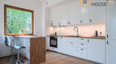 W całym szeregowcu znajdują się wysokiej jakości, podświetlane drewniane schody, które dodają elegancji i nowoczesności każdemu z domów. Ten element wykończenia nie tylko zapewnia funkcjonalność, ale także estetycznie podkreśla wnętrza, tworząc przyjemną atmosferę zarówno w dzień, jak i w nocy. Dzięki podświetleniu schodów, mieszkańcy mogą korzystać z nich bezpiecznie nawet po zmroku, a także dodatkowo akcentują one design wnętrza, nadając mu wyjątkowy charakter.