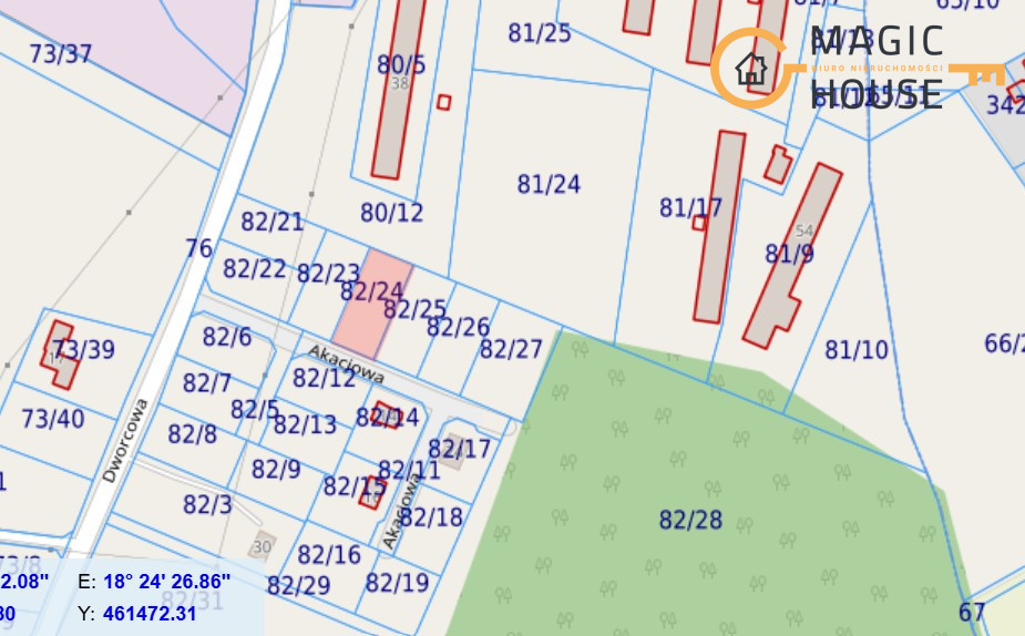Na sprzedaż działka budowlana o powierzchni 1064 m², zlokalizowana w miejscowości Przyjaźń (gmina Żukowo, powiat kartuski) przy ul. Akacjowej, numer ewidencyjny 82/24.