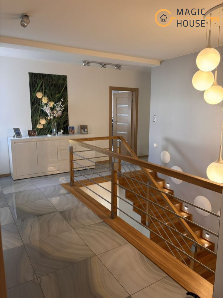 Nieruchomość składa się z dwóch kondygnacji. Na parterze znajduje się salon z kominkiem wraz z jadalnią i otwartą kuchnią, przestronny wiatrołap, jedna sypialnia, łazienka oraz dwustanowiskowy garaż i osobna kotłownia. Na piętrze znajdują się 4 sypialnie, garderoba, łazienka i pralnia.