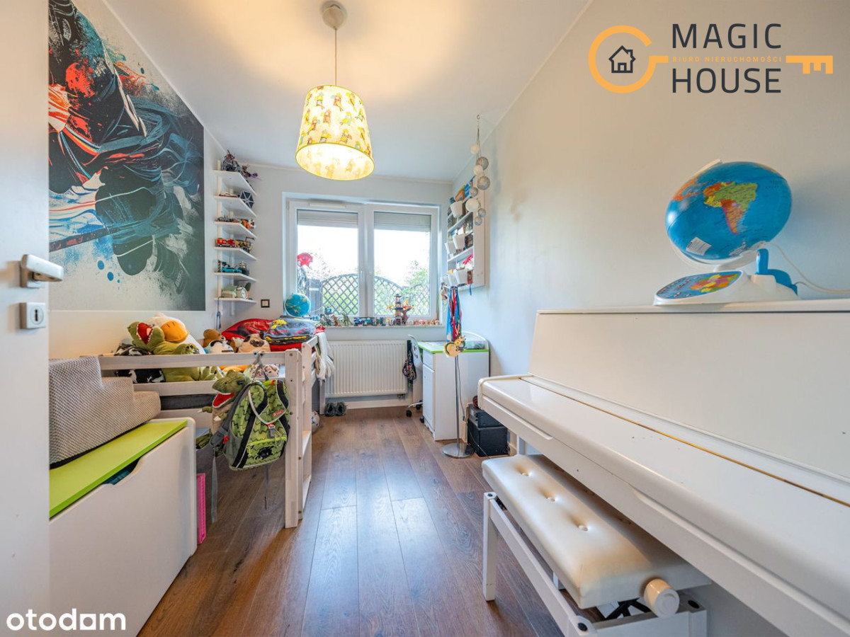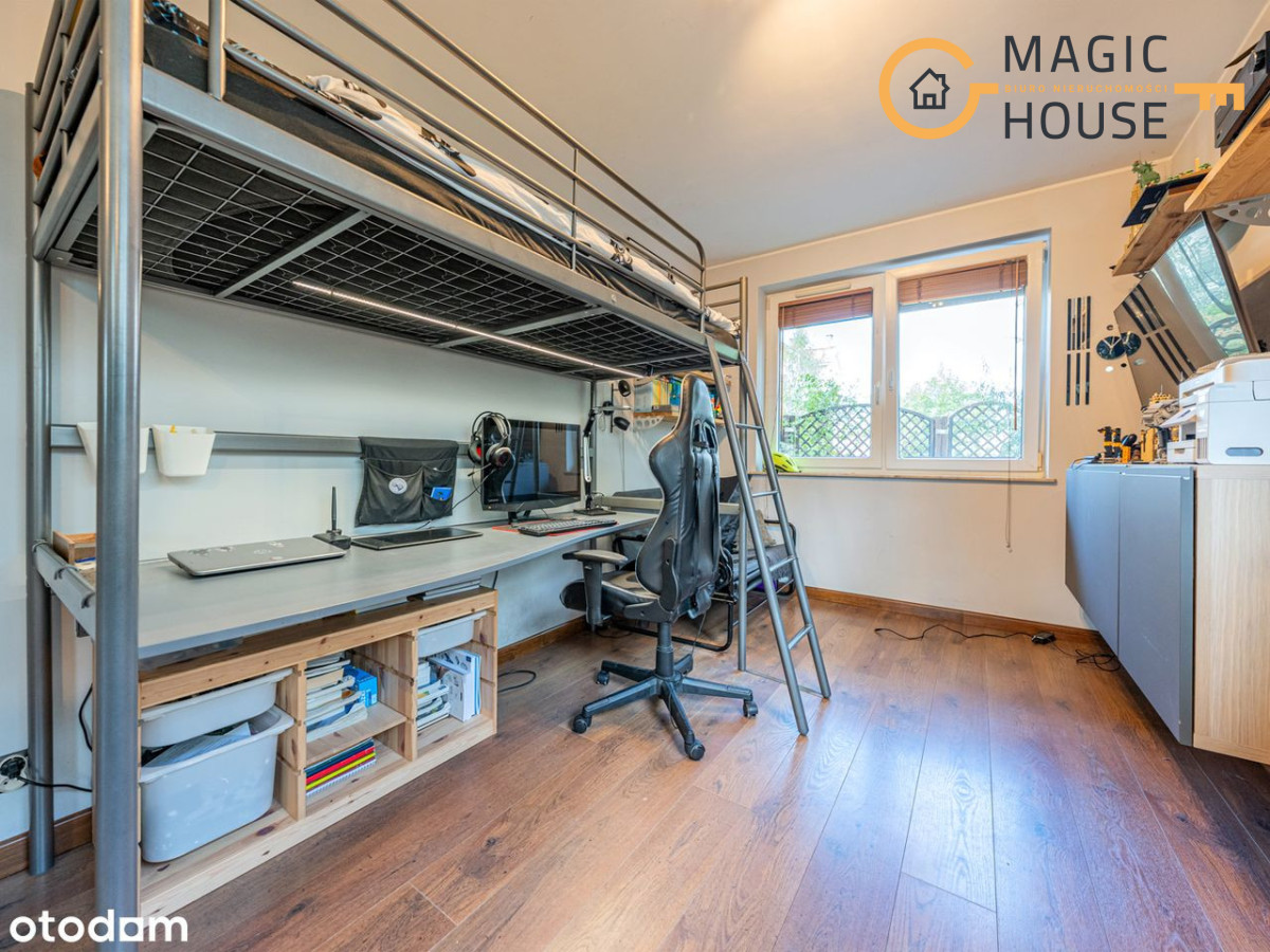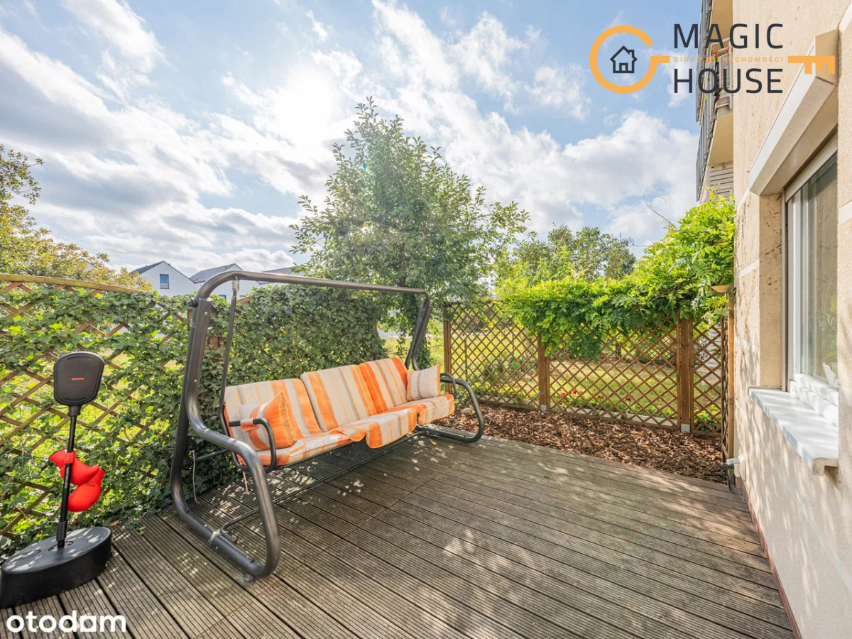 Atutem nieruchomości jest ogrodzony ogród o powierzchni 120 m², z drewnianym tarasem, otoczony roślinnością ozdobną i szpalerem iglaków. Drewniane ogrodzenie zapewnia prywatność i tworzy przytulną, kameralną atmosferę. To doskonałe miejsce na odpoczynek, spotkania z bliskimi czy spędzanie czasu na świeżym powietrzu.