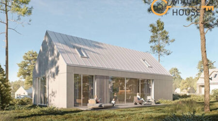 Dom zbudowany na planie prostokąta. Wejście znajdujące się na głównej ścianie budynku, zaprasza nas do części wspólnej – do salonu z jadalnią i kuchni. Wiemy, jak ważny jest kontakt z naturą, dlatego wyjść na zewnątrz możesz z każdego pomieszczenia na parterze Domu. W wysokim na dwie kondygnacje salonie, znajduje się kominek, a przeszklone drzwi przesuwne otwierają salon bezpośrednio na ogród. Schody prowadzą na antresolę i do dodatkowych sypialni.