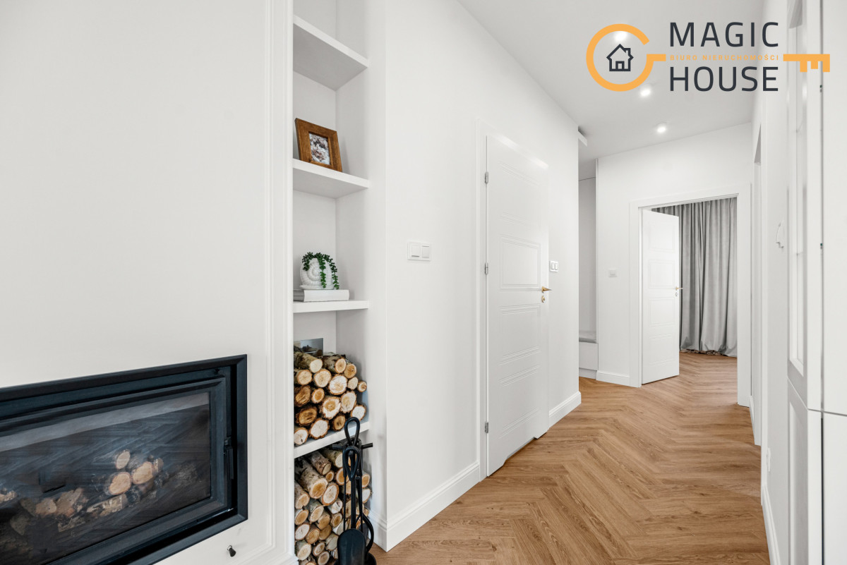 Wnętrze łączy nowoczesny design z ponadczasową elegancją – jasne kolory, naturalne materiały i duże przeszklenia zapewniają doskonałe doświetlenie i poczucie przestrzeni.
