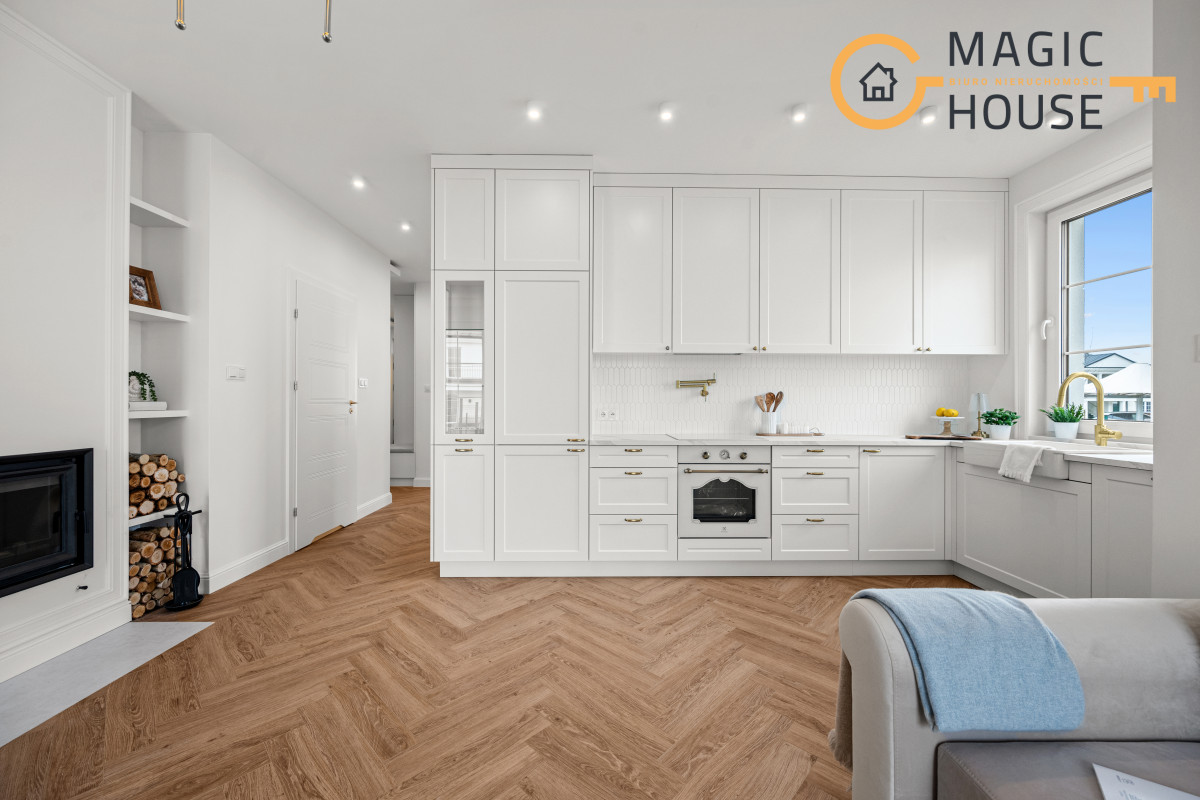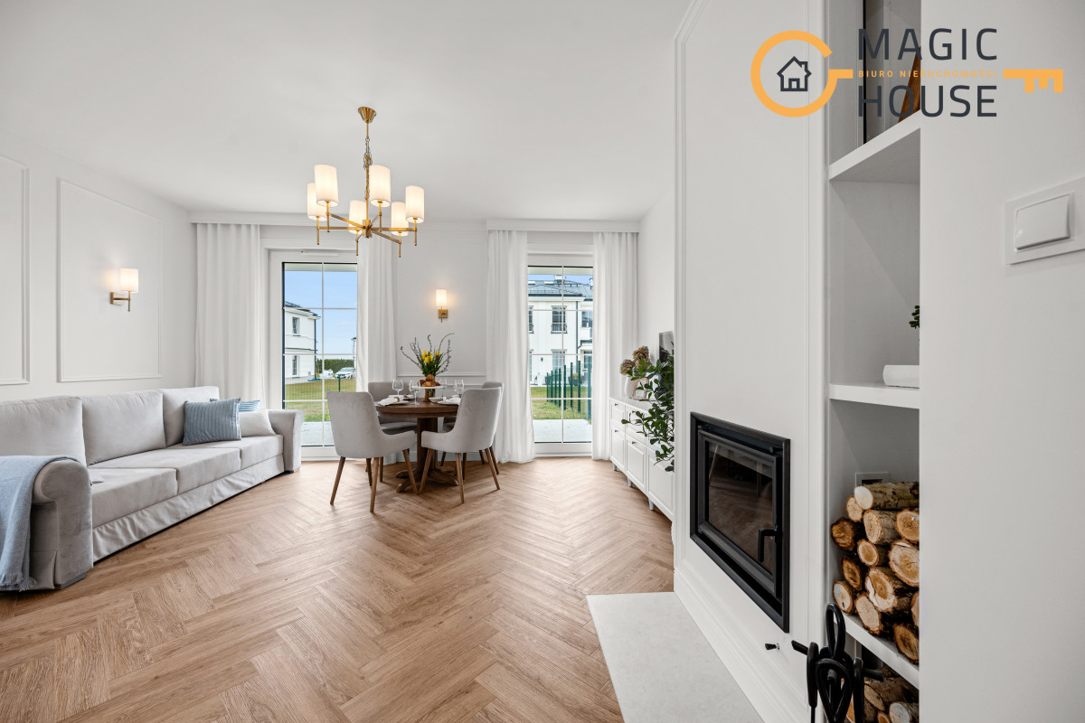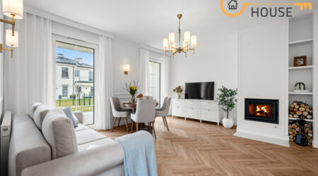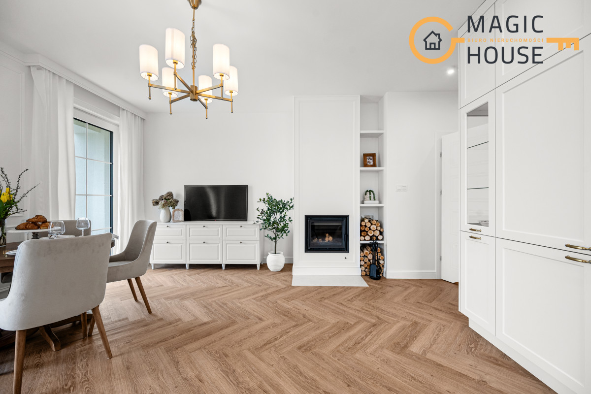 Wnętrze łączy nowoczesny design z ponadczasową elegancją – jasne kolory, naturalne materiały i duże przeszklenia zapewniają doskonałe doświetlenie i poczucie przestrzeni.