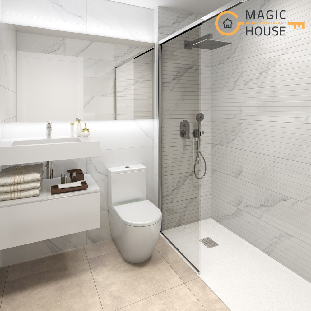 W pełni wyposażone łazienki z szafką podumywalkową, toaletą, lustrem i parawanami prysznicowymi.