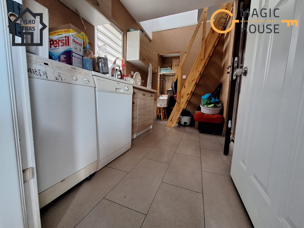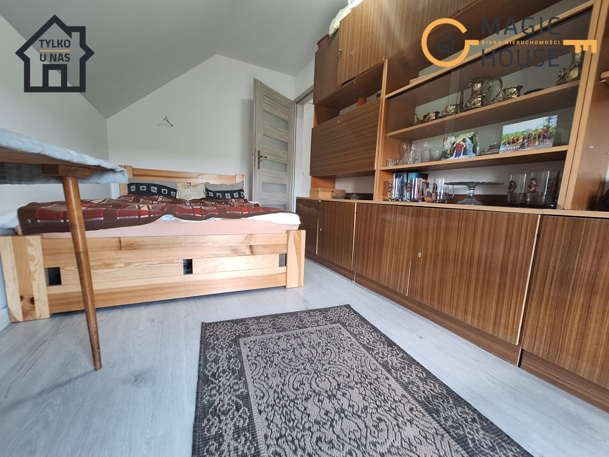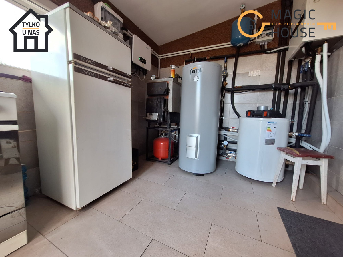 Na pierwsze piętro prowadzą drewniane schody. Ogrzewanie zapewnia pompa ciepła, natomiast energię elektryczną instalacja fotowoltaiczna (oba zainstalowane w 2023 roku). Przed domem wyłożono szarą i granatową kostkę brukową. Na zewnątrz znajduje się blaszany garaż. Przy wjeździe na posesję znajduje się metalowa brama wjazdowa. Większość działki jest nieogordzona.