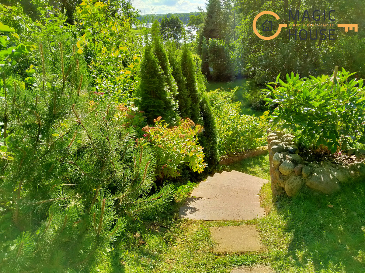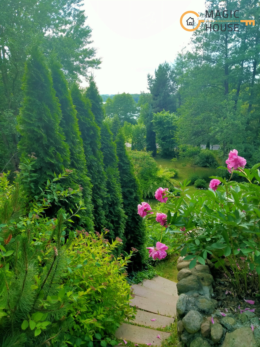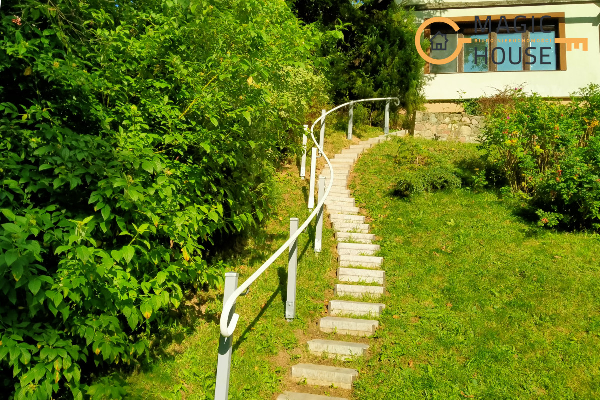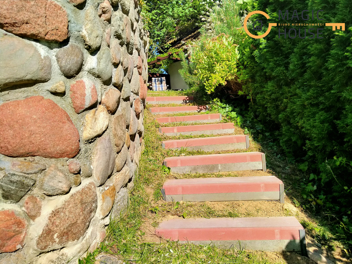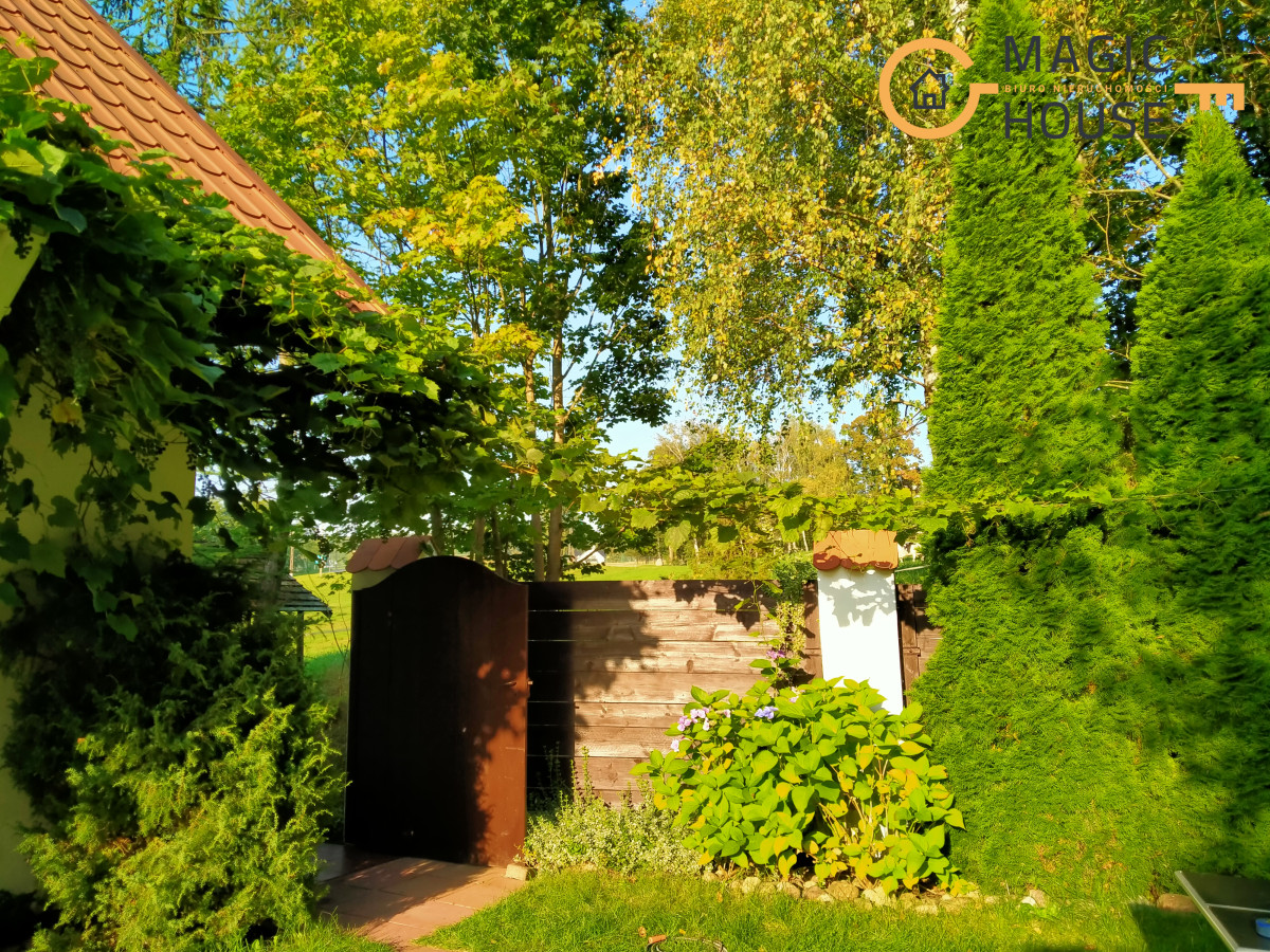 Z domu prowadzi bezpośrednie wyjście na zadbany ogród, który stanowi idealną przestrzeń do wypoczynku i relaksu. Działka posiada naturalne, atrakcyjne ukształtowanie terenu – opada w kierunku zachodnim, tworząc zieloną skarpę obsadzoną trawą i krzewami ozdobnymi. W skarpę wkomponowane są schody terenowe, prowadzące do dolnej, największej części działki.