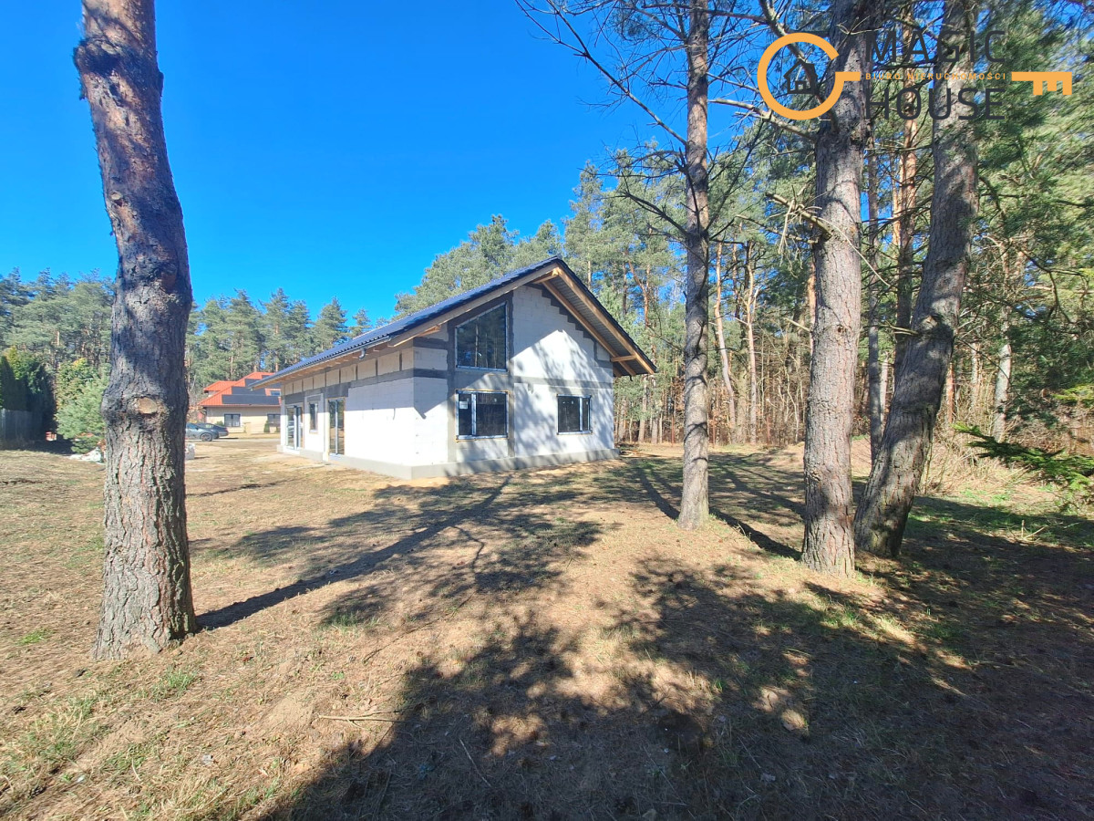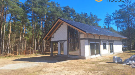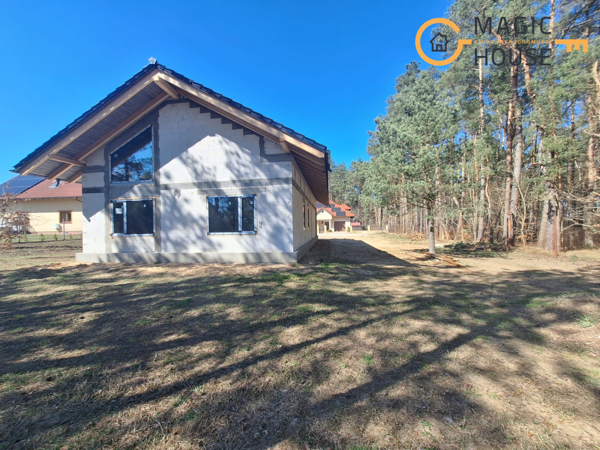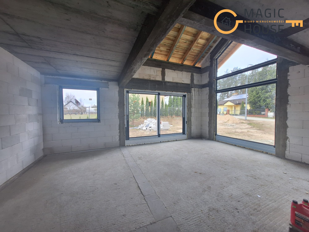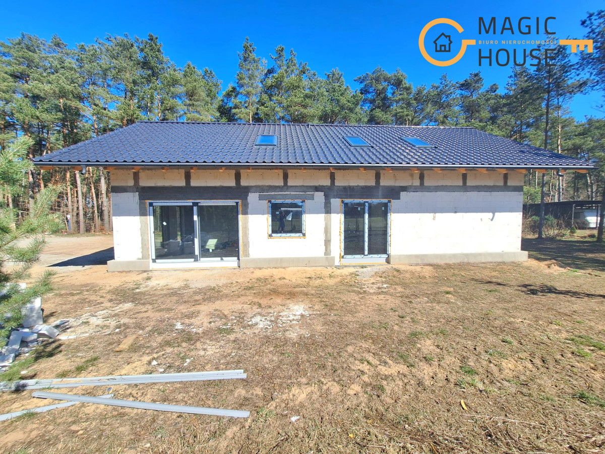 Centralnym punktem domu jest przestronny salon połączony z jadalnią oraz kuchnią wyposażoną w wyspę i bark śniadaniowy. Duże, przesuwne przeszklenia umożliwiają płynne przejście na taras, tworząc spójną przestrzeń do wypoczynku. W części prywatnej znajdują się komfortowe sypialnie, w tym pokój rodziców z garderobą oraz dwa ustawne pokoje dla dzieci.