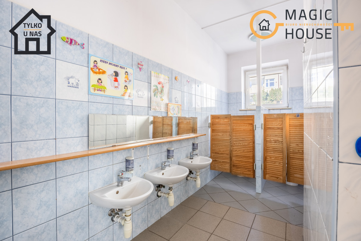 Parter- 6 pomieszczeń (dwie duże sale, kuchnia, pomieszczenie socjalne, dwie toalety oraz duża łazienka dziecięca z prysznicem i dwiema toaletami.