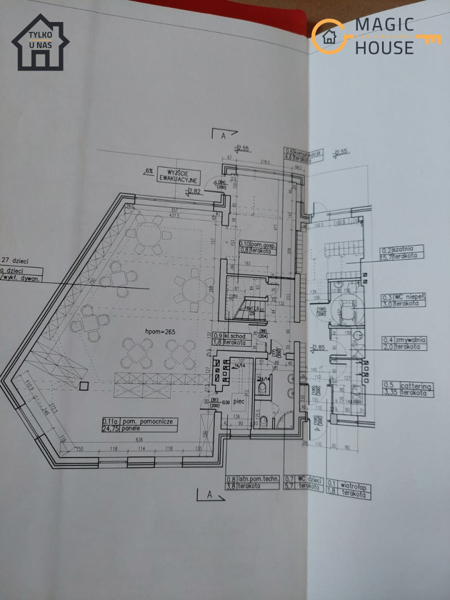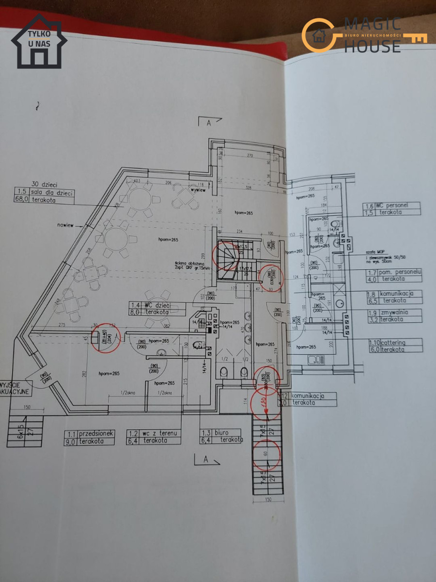 Parter- 6 pomieszczeń (dwie duże sale, kuchnia, pomieszczenie socjalne, dwie toalety oraz duża łazienka dziecięca z prysznicem i dwiema toaletami.