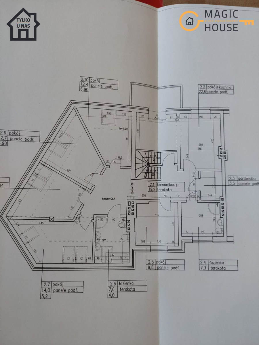 I Piętro- pokój z aneksem kuchenny, balkon, 5 pokoi, 1 pomieszczenie gospodarcze, 2 łazienki, w tym jedna z wanną a druga z prysznicem.