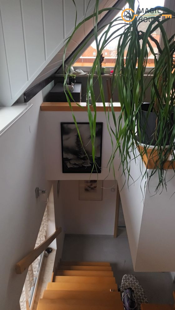 – Poddasze: otwarta, przestronna strefa dzienna z wyjściem na taras o powierzchni 18 m², z którego rozciąga się widok na las, okolicę i morze. Na tym poziomie znajduje się również sypialnia oraz garderoba.