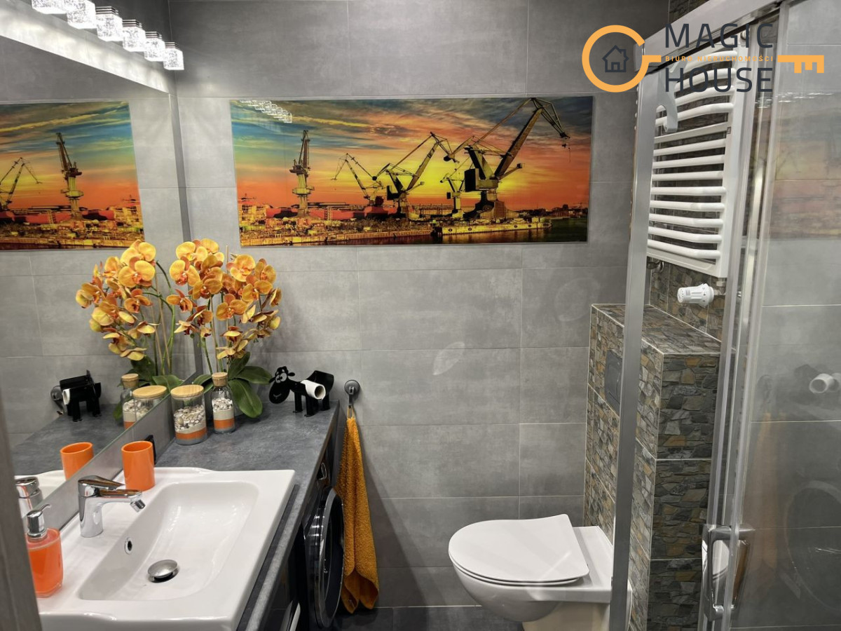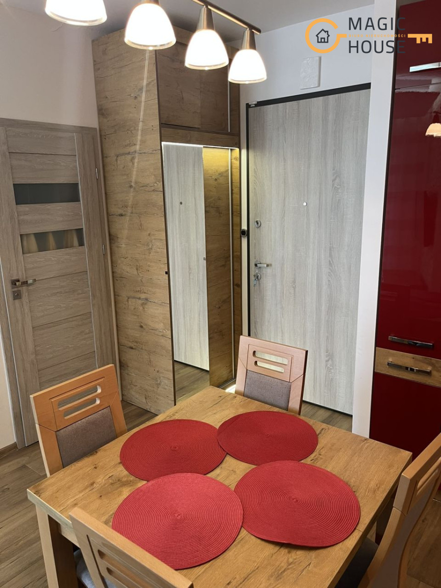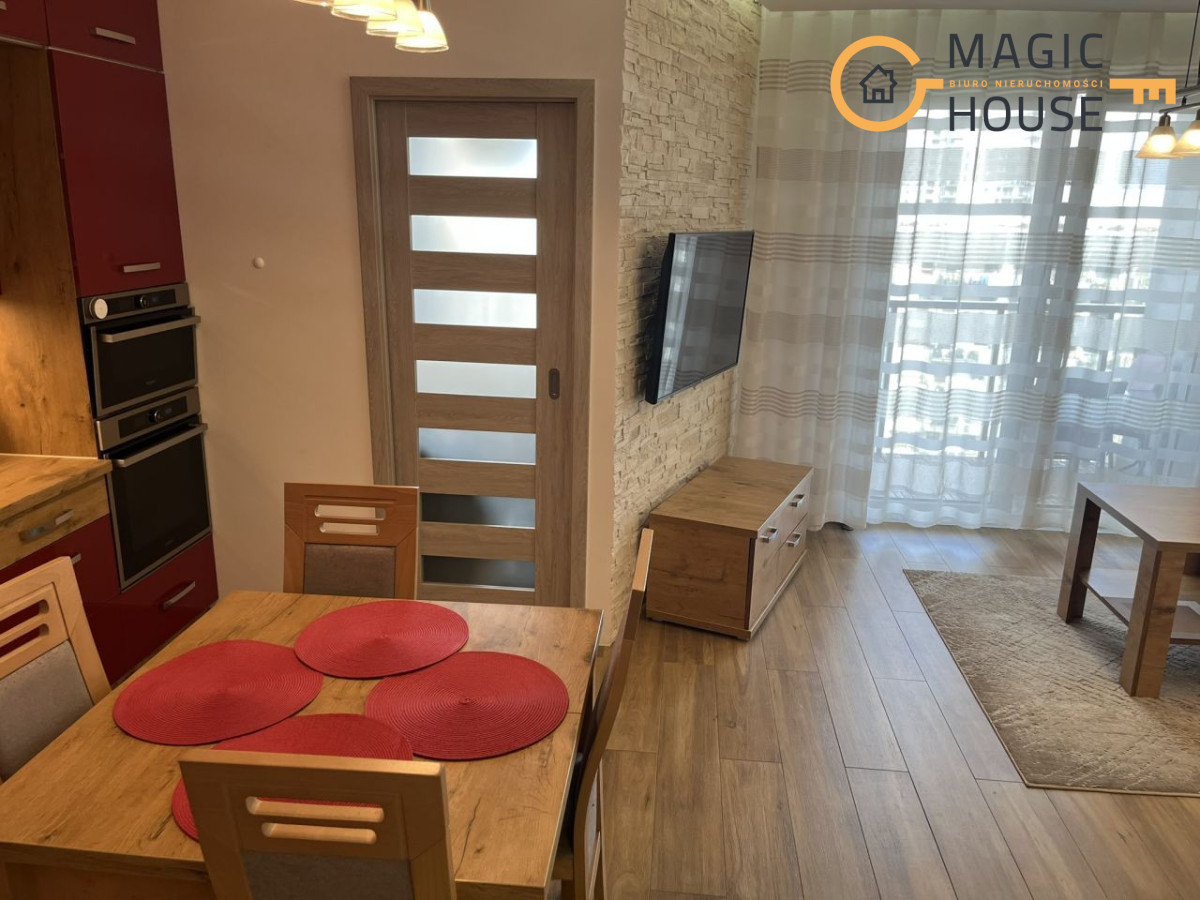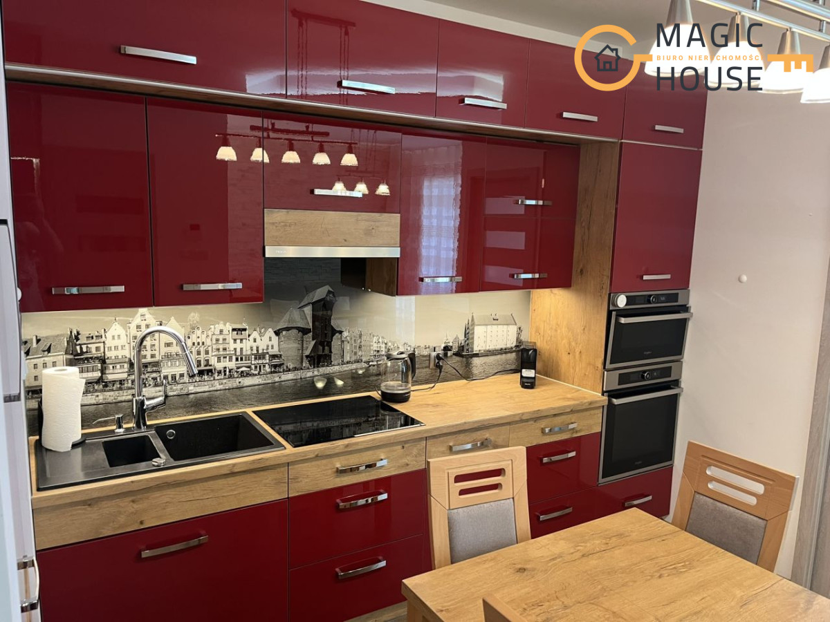 Mieszkanie posiada w pełni wyposażoną kuchnie: mikrofalówka, płyta indukcyjna, piekarnik, sztućce, naczynia, garnki. oraz łazienkę wyposażoną w pralkę.