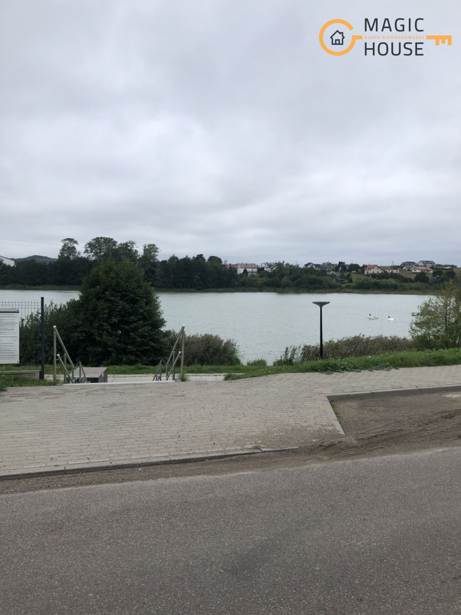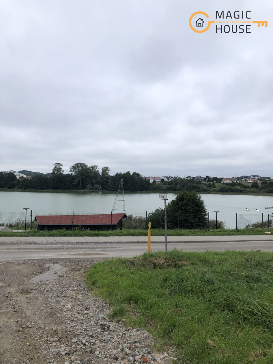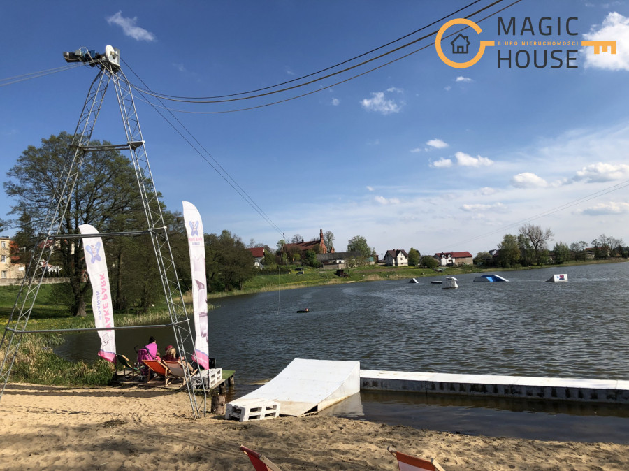Naprzeciw działki – jezioro z plażą i wyciągiem do nart wodnych.