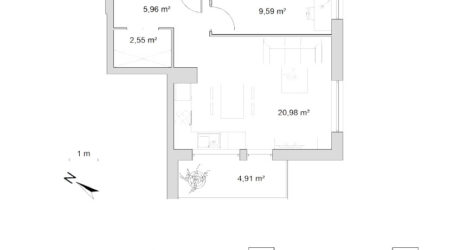 Prezentowane 2pokojowe mieszkanie o metrażu 44,49m2 z balkonem i z wydzielonym miejscem na garderobę mieści się na pierwszym piętrzę czteropiętrowego budynku.