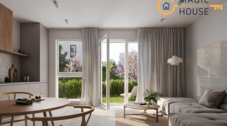 Ogromnym atutem nieruchomości jest prywatny ogród o powierzchni ok. 65 m², który stanowi naturalne przedłużenie salonu.