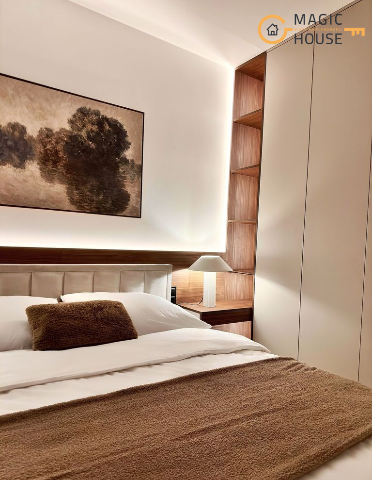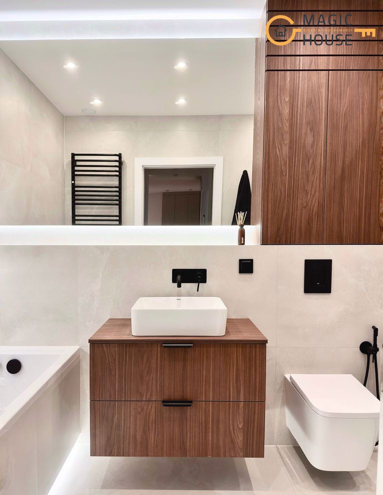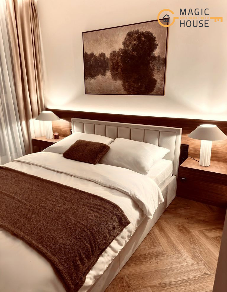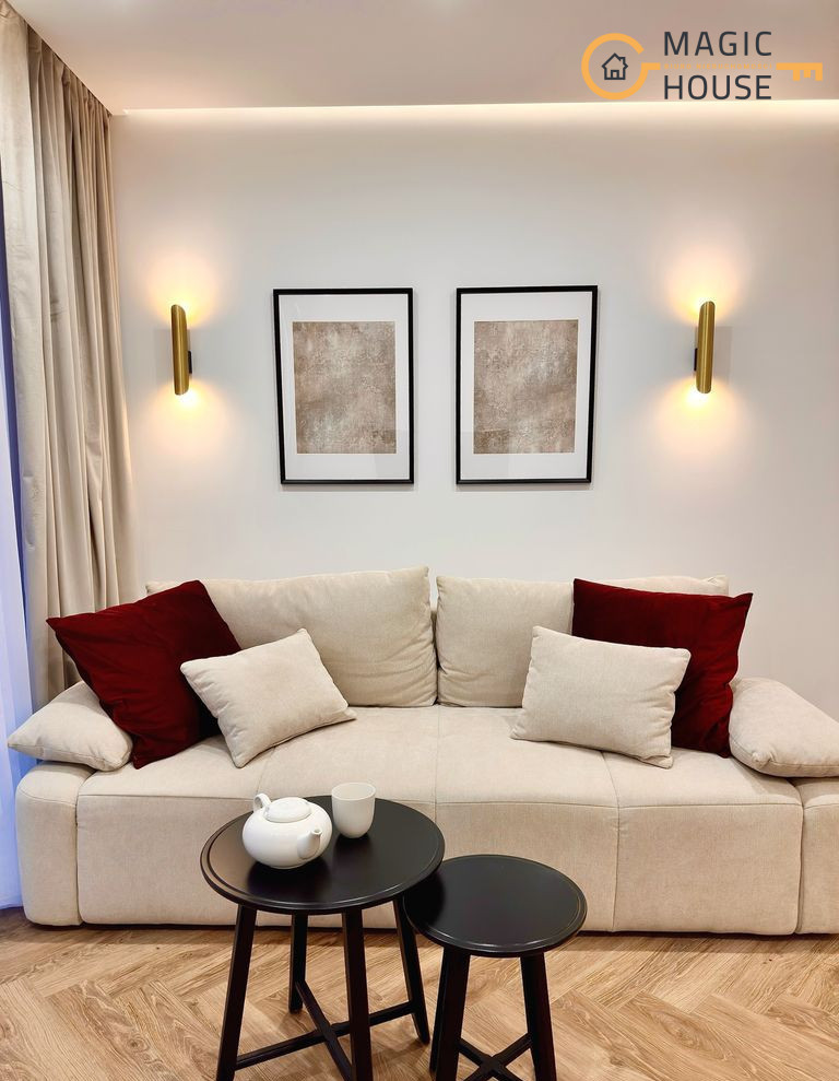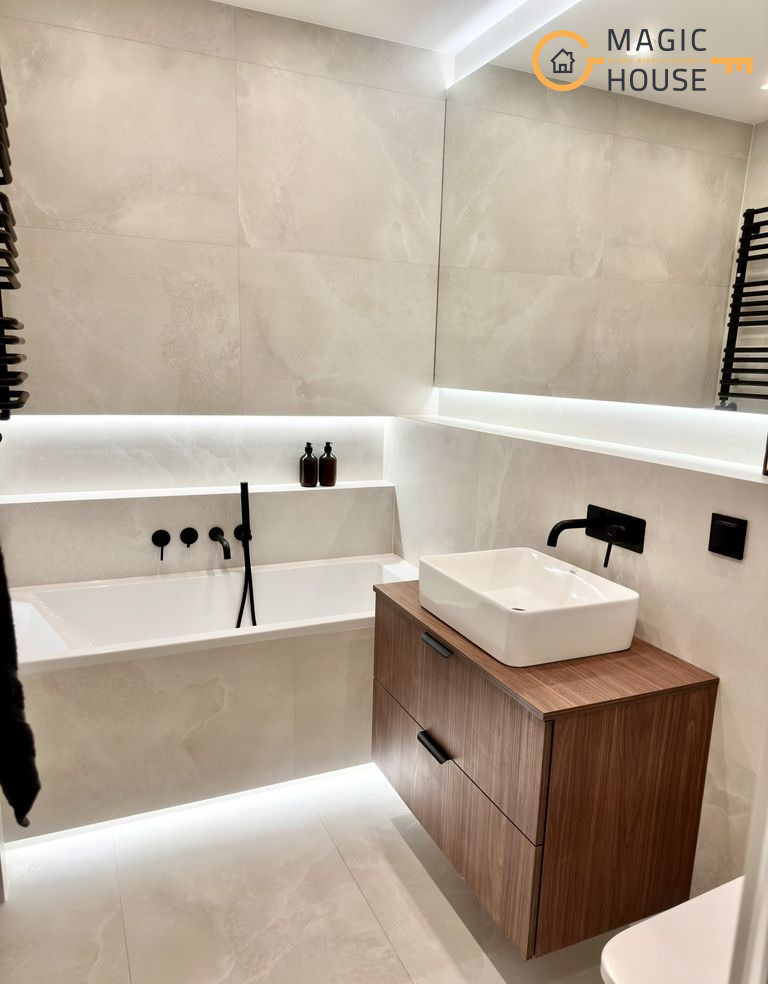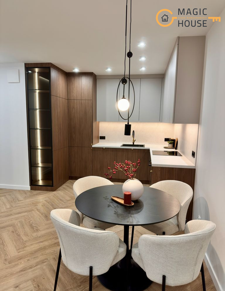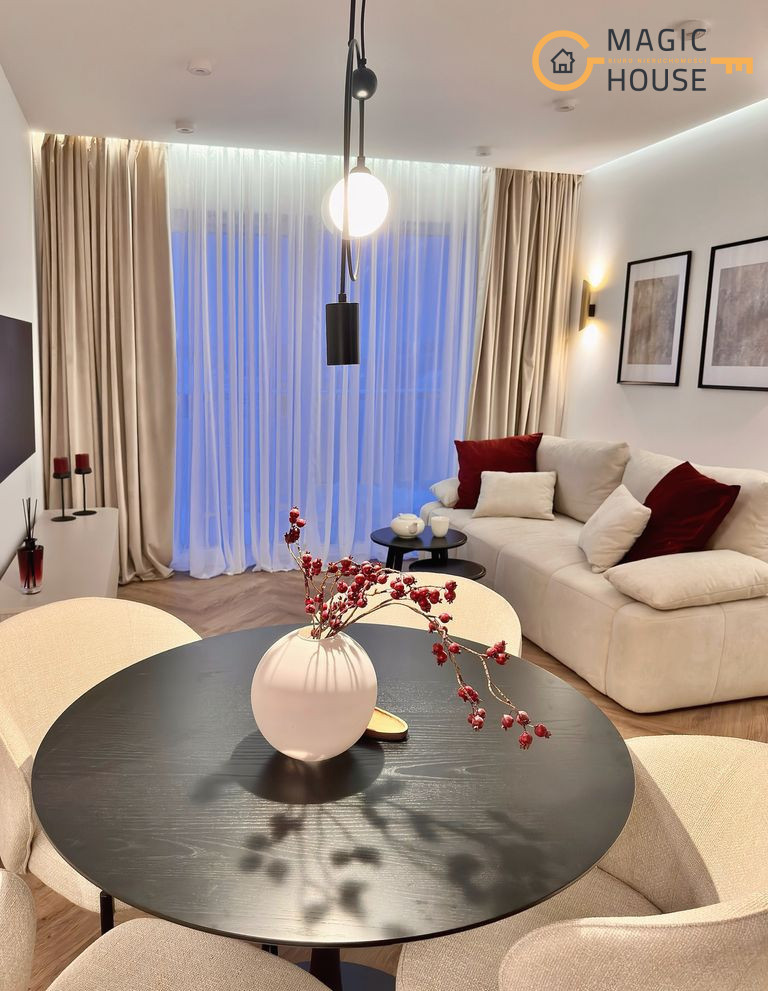 • Wysoki standard wykończenia – mieszkanie urządzone z użyciem trwałych i estetycznych materiałów