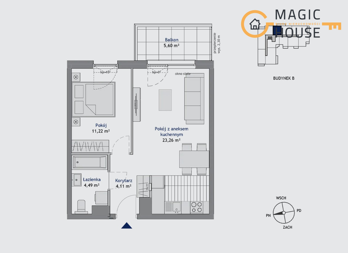 Salon z aneksem kuchennym (23,26 m2) to serce mieszkania – miejsce, w którym można wspólnie spędzać czas, gotować i odpoczywać. Duże przeszklenia zapewniają naturalne doświetlenie, a wyjście na balkon (5.60 m2) od strony wschodniej pozwala cieszyć się świeżym powietrzem i stworzyć przytulny kącik do relaksu – idealny na poranną kawę lub popołudniową lekturę.