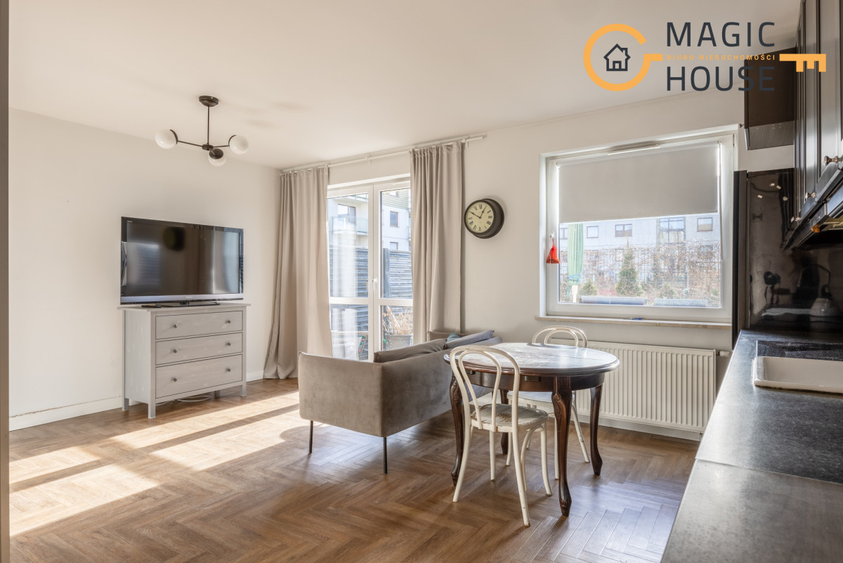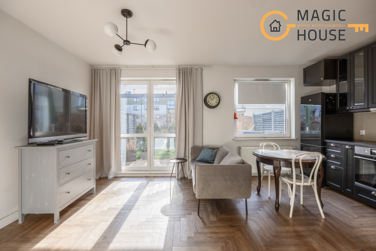 Z salonu wyjście na prywatny taras z ogródkiem.