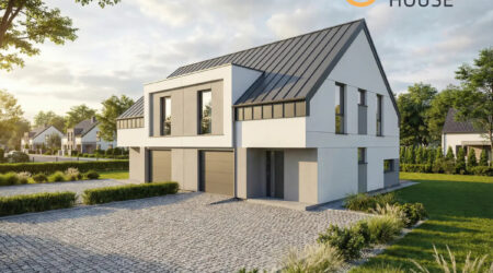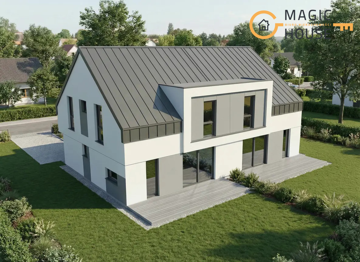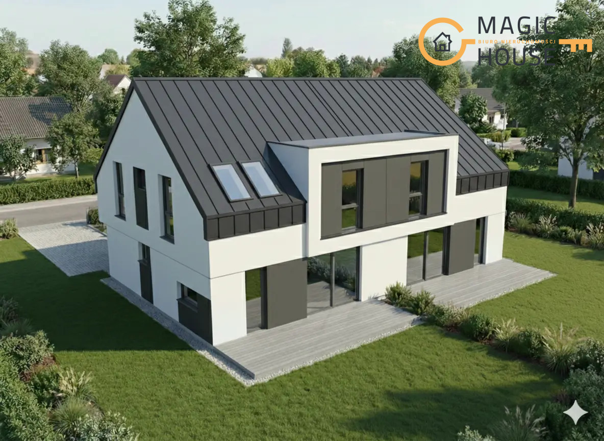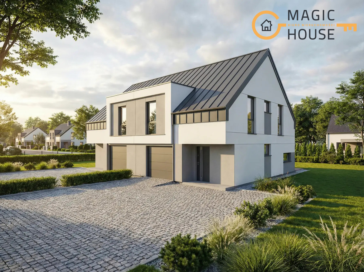 Dom został zaprojektowany z myślą o funkcjonalności i wygodzie mieszkańców. Nowoczesna bryła z dużymi przeszkleniami zapewnia doskonałe doświetlenie wnętrz, a przestronna działka o powierzchni około 500 m² daje wiele możliwości aranżacyjnych. To doskonałe miejsce dla rodzin, które szukają przestrzeni, bezpieczeństwa oraz wysokiego standardu życia.