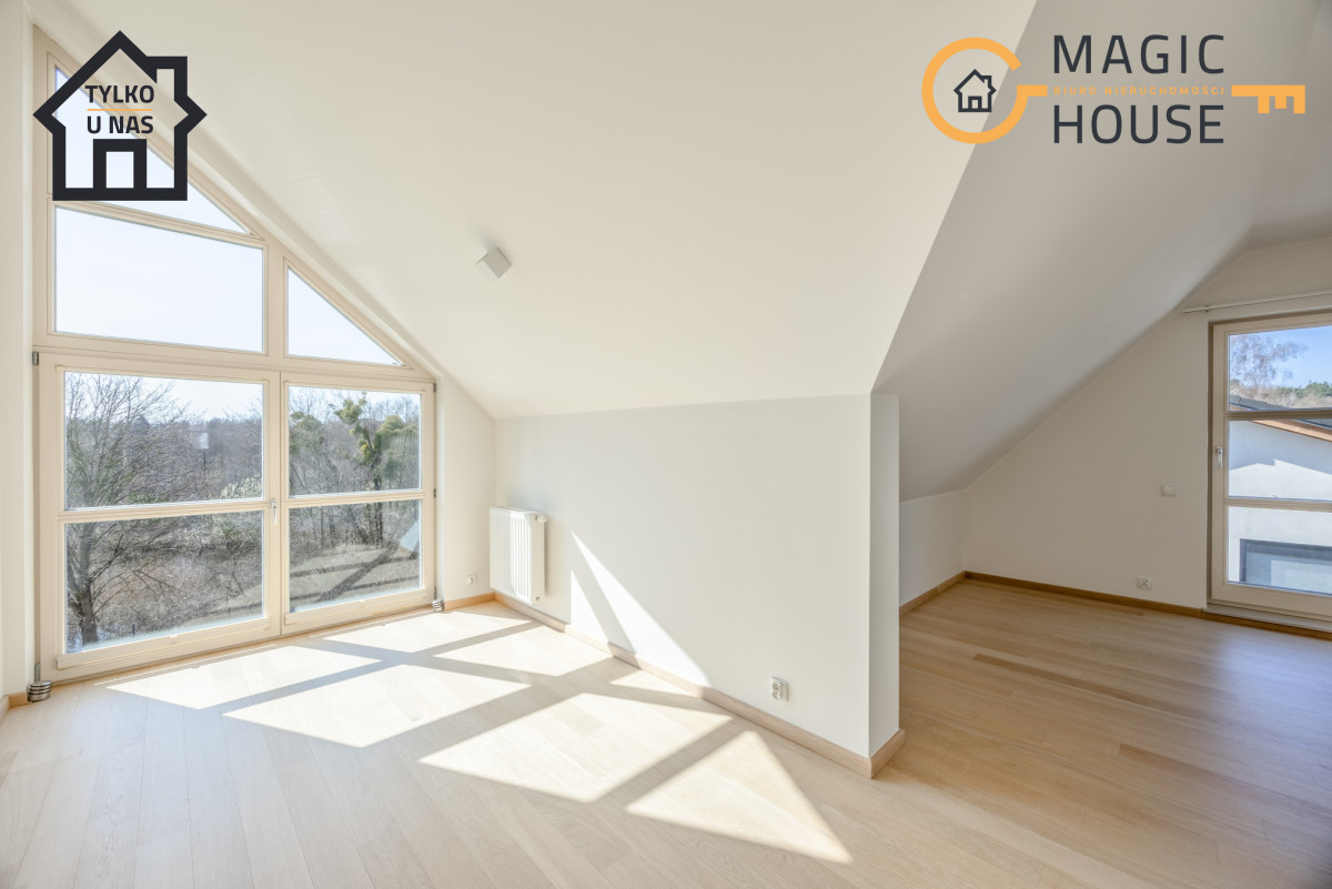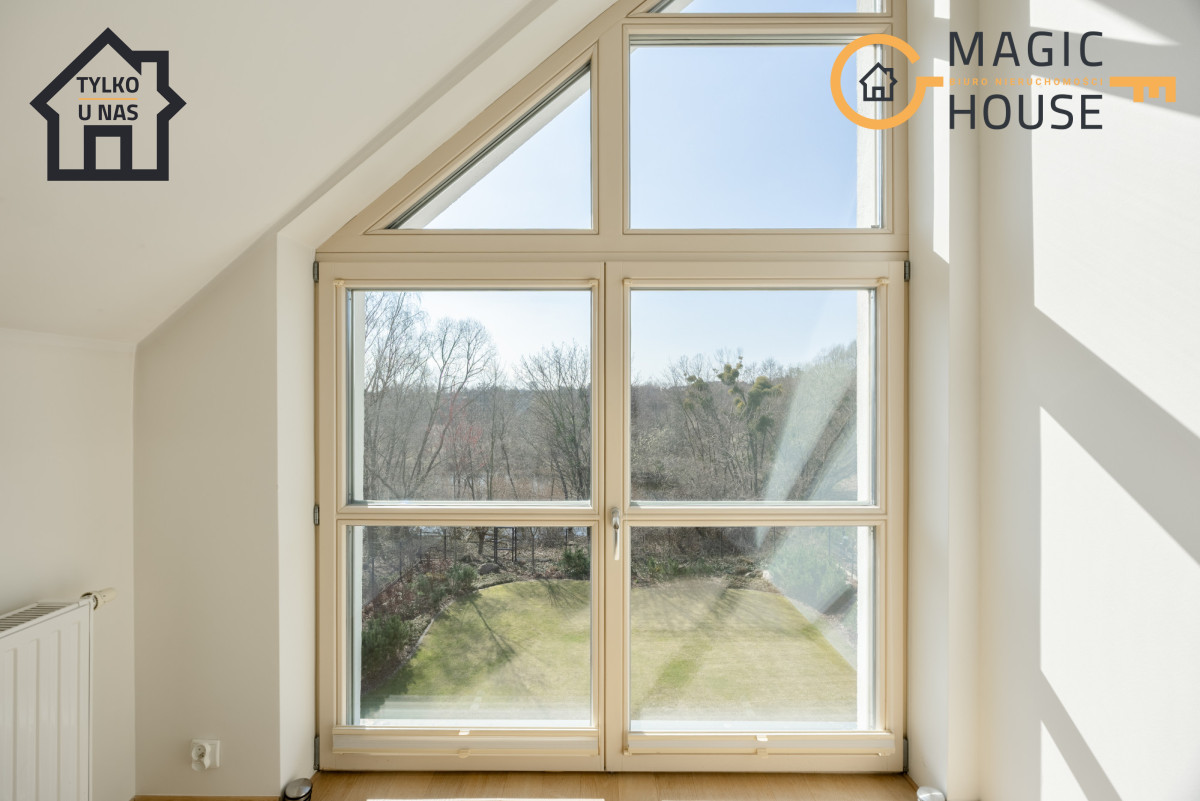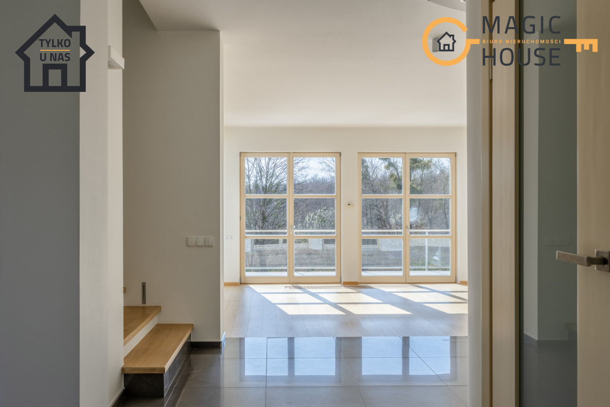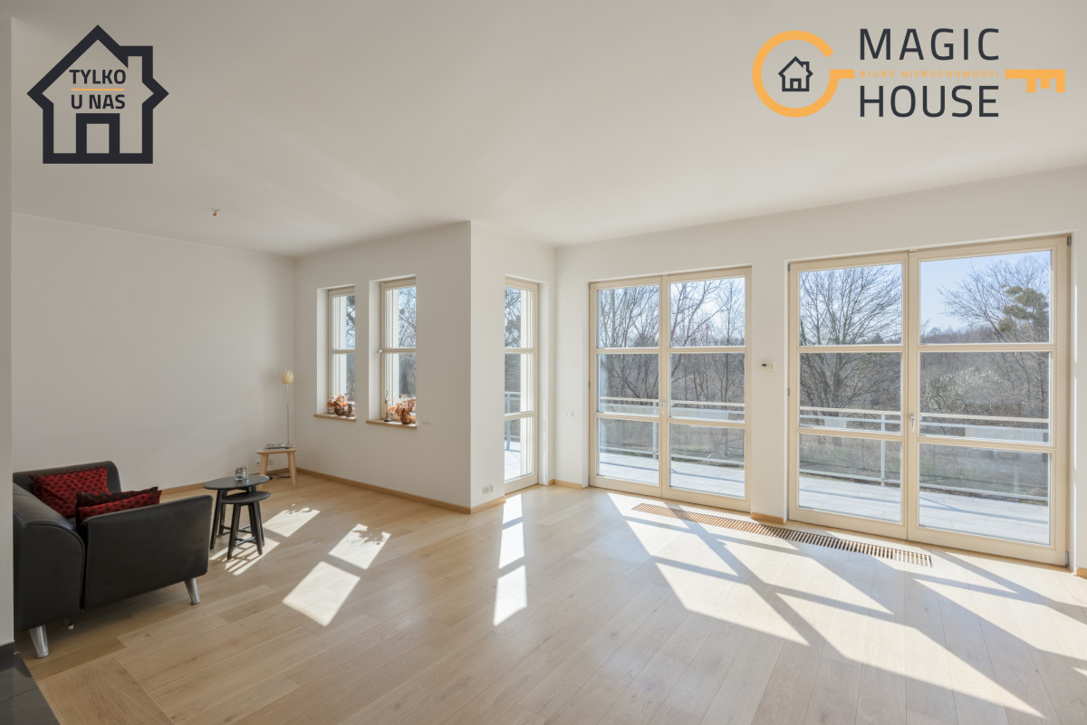 Na podłogach drewno, a liczne przeszklenia zapewniają doskonałe doświetlenie pomieszczeń.
