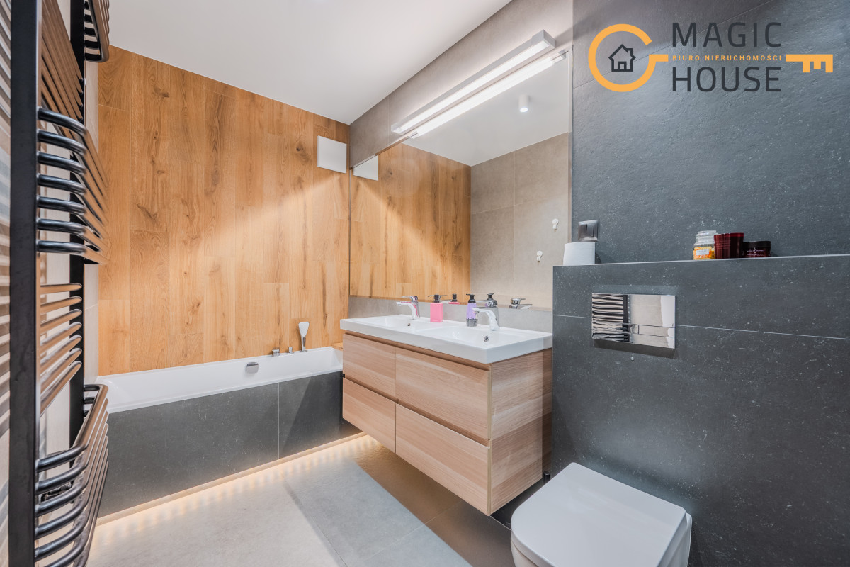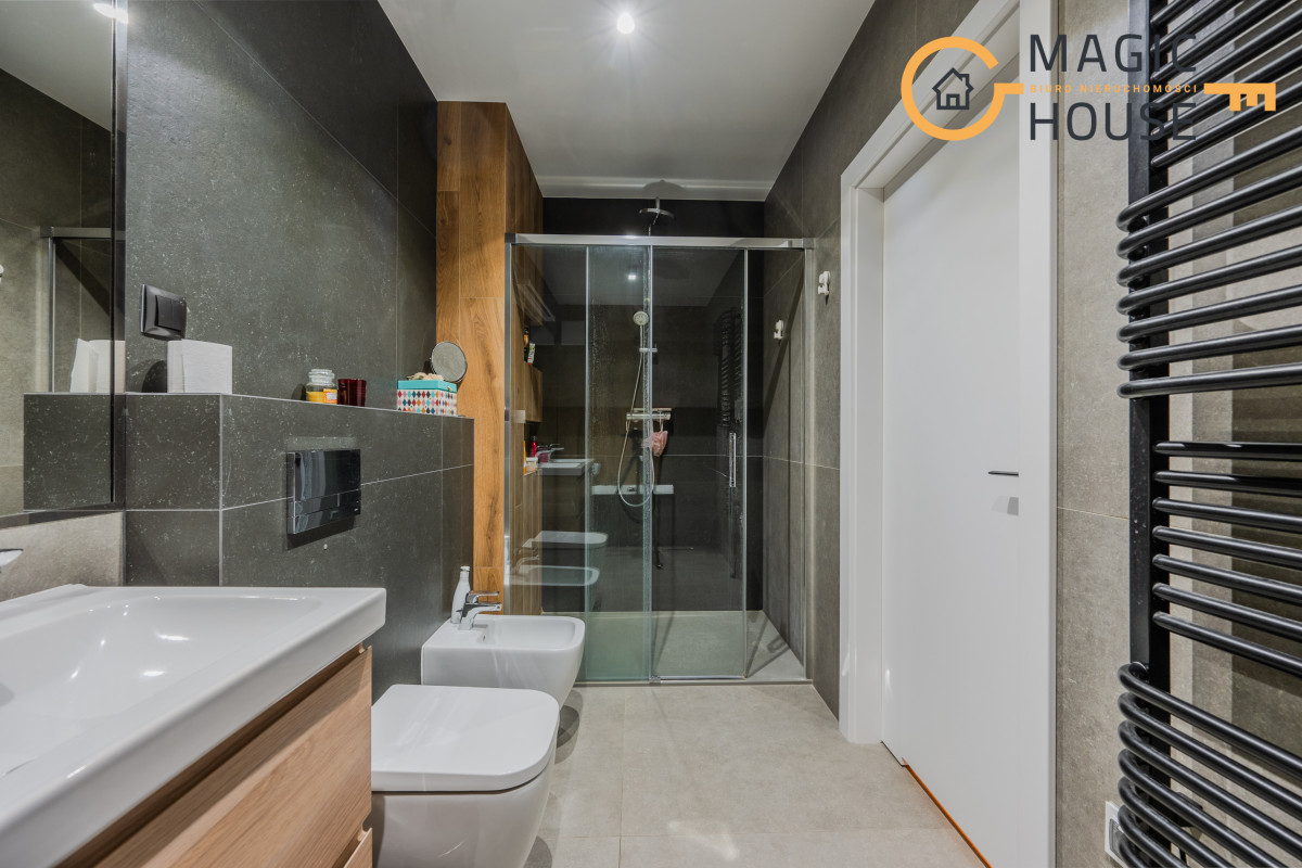 Wisienką na torcie jest system SMART HOME dzięki któremu, możemy sterować między innymi, ogrzewaniem podłogowym, w łazience, toalecie, przedpokoju, pomieszczeniu gospodarczym czy w kuchni. Zastosowanie SMART mają również między innymi żaluzje antywłamaniowe w dwóch drzwiach wyjściowych na ogród oraz we wszystkich oknach. Wysokiej jakości jest również armatura, z wbudowanym filtrem wody.