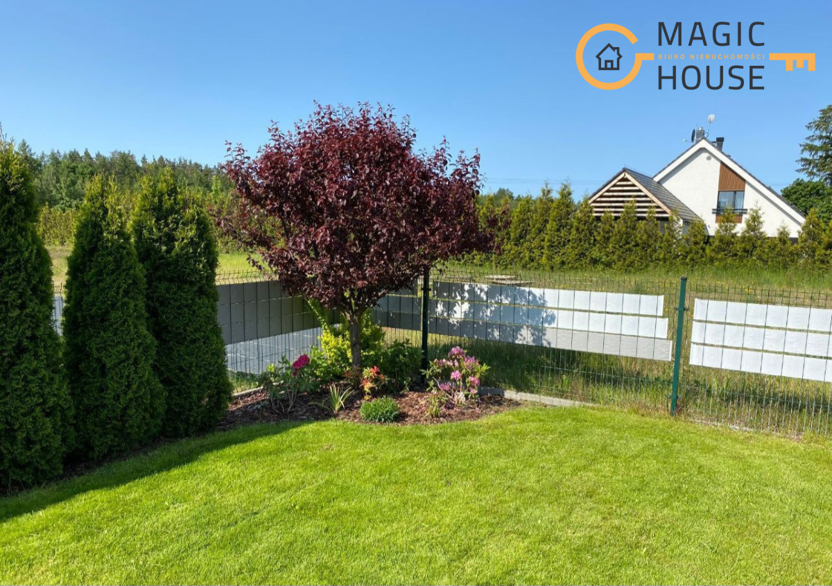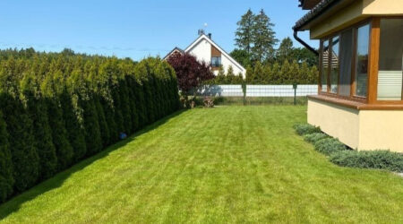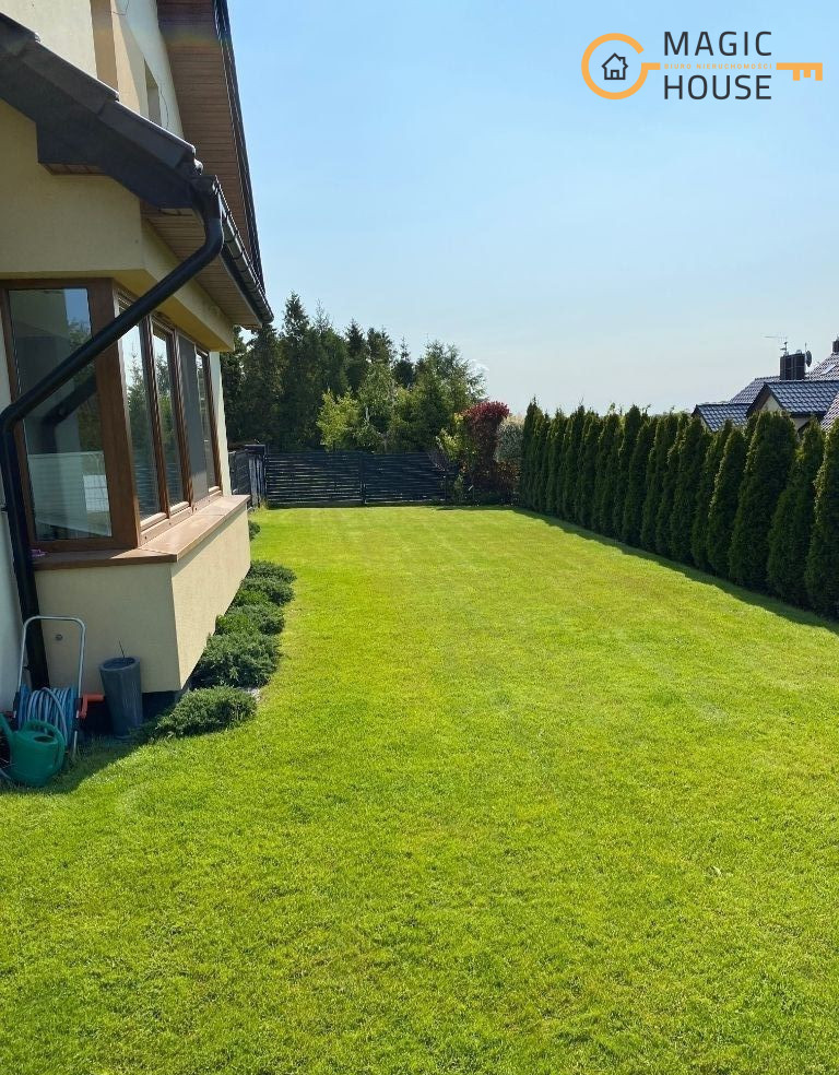 Zadbany, płaska działka, na całości części zielonej system automatycznego nawadniania, z możliwością zdalnego włączania podlewania.