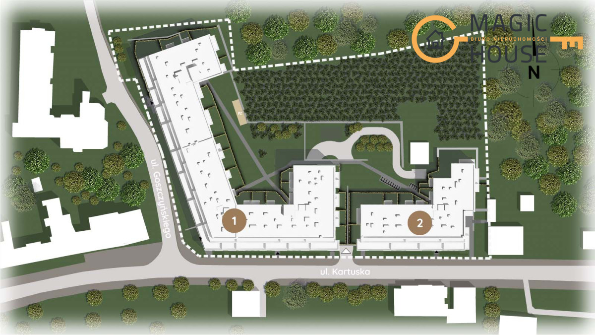 W ramach inwestycji zostały zaprojektowane dwa 6-piętrowe budynki wraz z podziemnymi halami garażowymi i lokalami usługowymi.