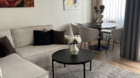 Wyposażenie obejmuje nowoczesne rozwiązania „Smart” do zdalnego sterowania ogrzewaniem i ciepłą wodą, monitorowanie zużycia energii oraz powiadomienia o usterkach. Mieszkanie jest w pełni umeblowane, z zabudowami na zamówienie, LED-owym podświetleniem w szafach, dębową podłogą, pełnym AGD w kuchni, pralką w łazience i Smart TV w salonie. Dodatkowo, kanapa w salonie posiada funkcję spania.