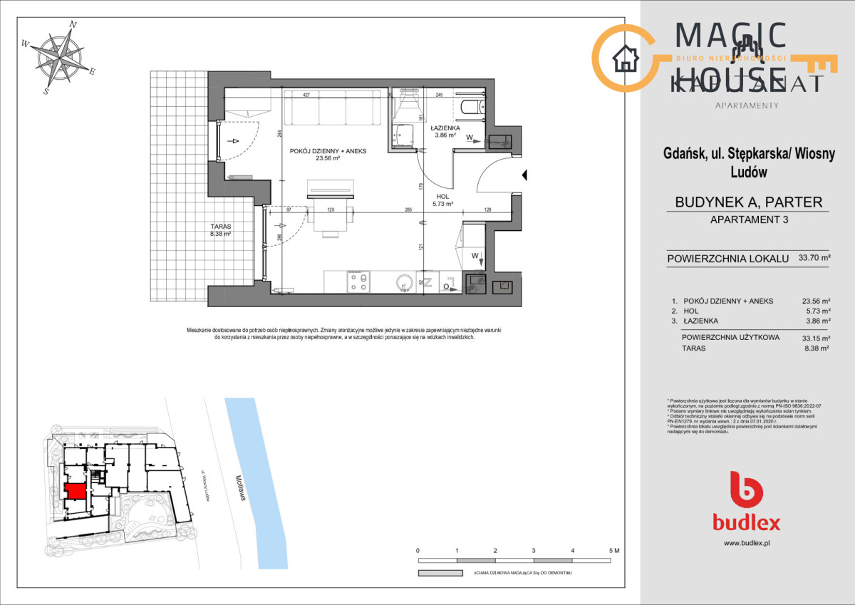 Nowy apartament o oznaczeniu znajduje się na ostatnim piętrze i jest 5-pokojowy. Posiada duży i narożny taras o powierzchni 120,55m.