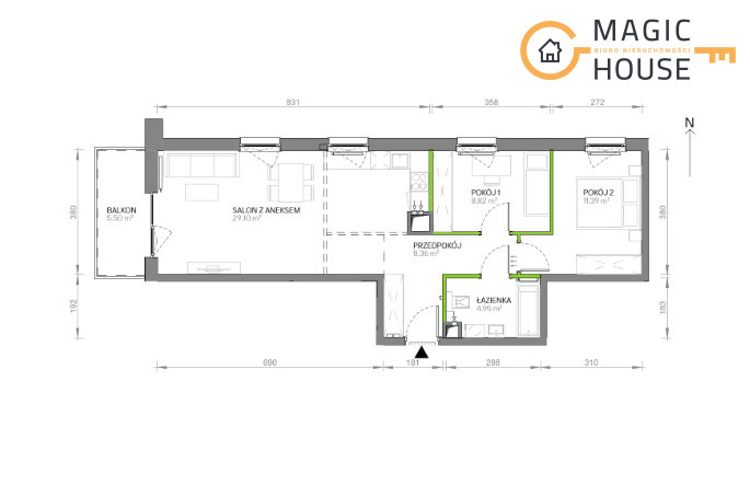 • układ: salon z aneksem kuchennym (29 m²), dwa niezależne pokoje (11,39 m² i 8,82 m²), łazienka i przedpokój