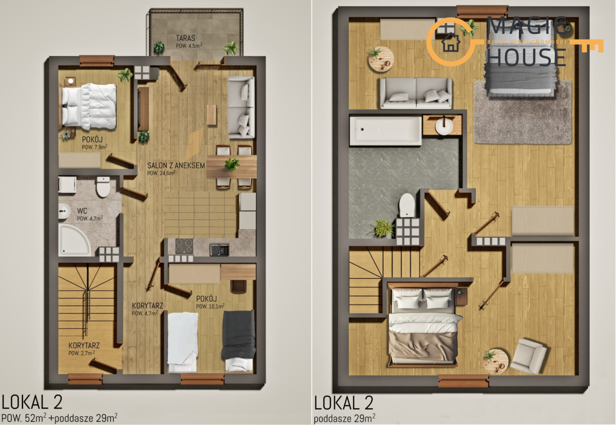 2. Mieszkania dwupoziomowe na piętrze i poddaszu