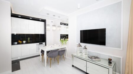 Aneks kuchenny, to połączenie bieli minimalistycznych mebli oraz czerni marmurowych kafli, tak charakterystyczne dla stylu glamour. Dopełnienie tej kompozycji stanowi konglomeratowy zlew, mosiężny kran i markowy sprzęt AGD: zmywarka, lodówka z zamrażarką, piekarnik oraz płyta indukcyjna i pochłaniacz. Wszystko to czeka na kuchenne wariacje i spotkania z przyjaciółmi.