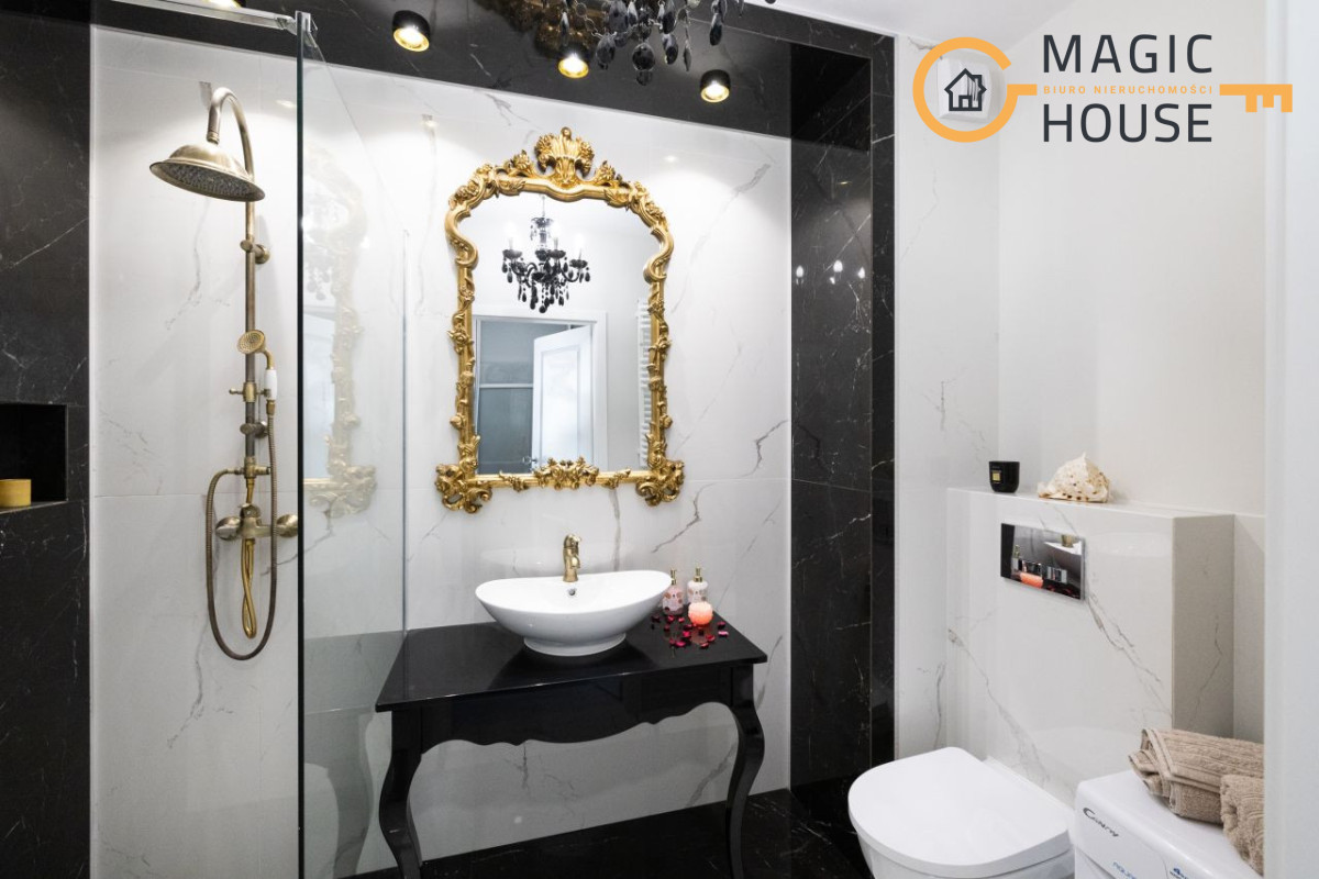 Barokowy przepych i elegancja to cechy łazienki utrzymanej w barwach bieli i czerni przełamanej różnymi odcieniami złota. Komfort i wygodę zapewnia obszerna kabina prysznicowa osłonięta hartowaną szybą. Centralnym punktem kompozycji jest designerskie lustro, oprawione w złotą bogato zdobioną ramę, dominującą nad białą ceramiczną umywalką osadzoną na czarnej, stylowej konsoli.