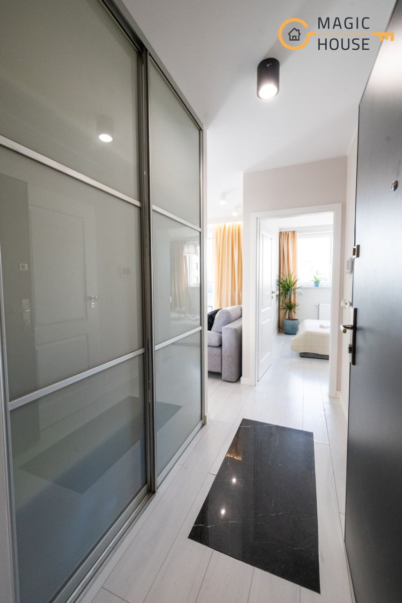 Prezentowany apartament otwiera przedpokój zaaranżowany w minimalistycznym stylu, którego niewątpliwym atutem jest obszerna szafa wnękowa, dyskretnie ukryta za przesuwanymi drzwiami z mlecznego szkła. Przedpokój zaprasza do eleganckiego i dobrze doświetlonego południowo-zachodnim słońcem salonu oraz przytulnej sypialni i stylowej łazienki. Od razu widać, iż we wnętrzu rządzi szlachetna, stonowana i delikatnie zróżnicowana kolorystyka, z dominującym beżem ścian, szarością betonów i tkanin, bielą mebli, co w połączeniu z kryształowymi i złotymi dodatkami inspirowanymi stylem glamour stało się znakiem rozpoznawczymi prezentowanego apartamentu.