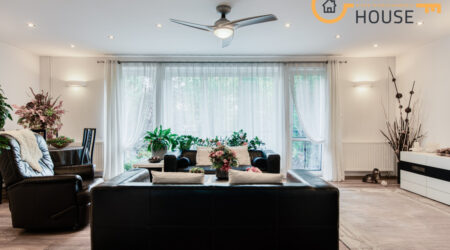 • Przestronny salon z dużymi oknami i wyjściem na balkon