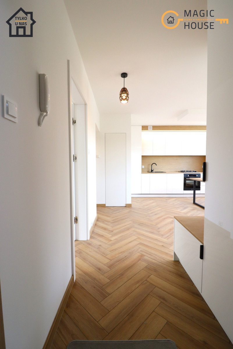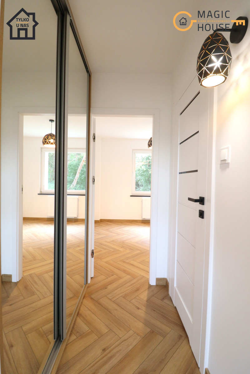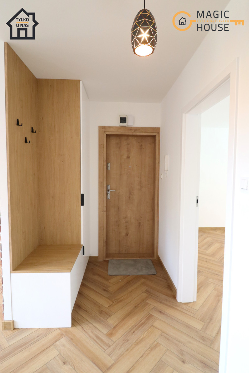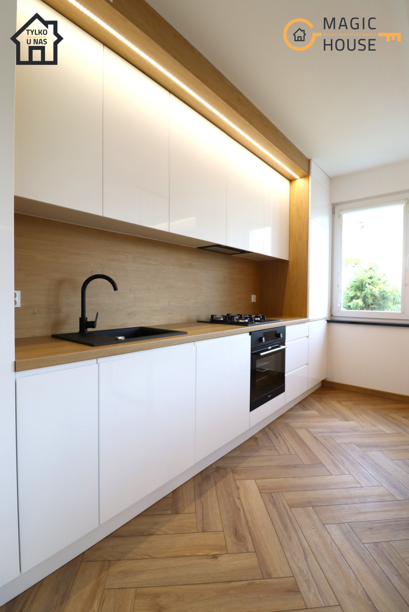 Nowe tynki, wylewki, cekole. W przedpokoju dwie szafy. Kuchnia w zabudowie ze sprzętem AGD (zmywarka, kuchnia gazowa 4 palnikowa, piekarnik, lodówka, okap). Szafki na systemach Blum. Okna PCV, drzwi wejściowe antywłamaniowe, nowe drzwi wewnętrzne, na podłogach panele winylowe jednolite w całym mieszkaniu oraz gres. Parapety wewnętrzne kamienne granit.