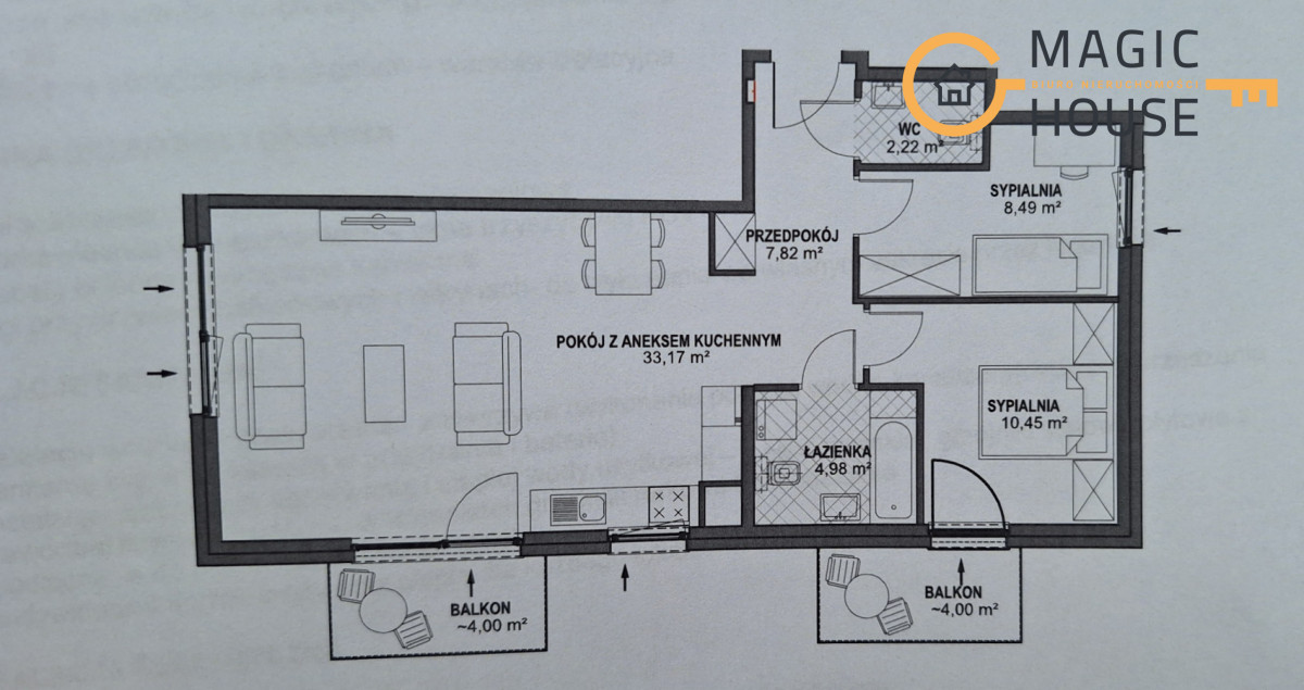 Głównym pomieszczeniem jest przestronny pokój z aneksem kuchennym ( 33m2) i wyjściem do słoneczny balkon. To idealne miejsce do relaksu, spożywania posiłków i spędzania czasu z bliskimi. Duże okna zapewniają obfite natężenie światła dziennego, co sprawia, że mieszkanie jest jasne i przyjazne.