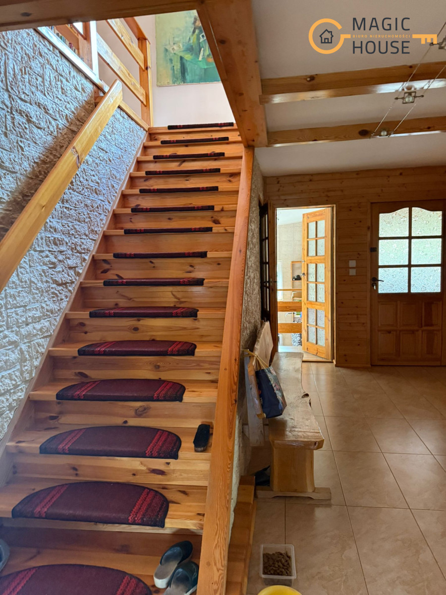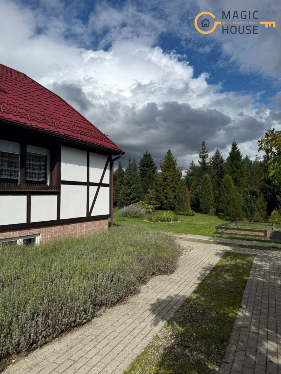 W centrum tej malowniczej nieruchomości znajduje się okazały dom o powierzchni 430 m², utrzymany w niepowtarzalnym stylu pruskim, który łączy elegancję, tradycję i nowoczesną funkcjonalność. Wnętrze zachwyca przestronnym salonem z kominkiem, pięcioma sypialniami, kuchnią z klimatycznym piecem kaflowym, reprezentacyjnym holem z drewnianymi schodami oraz dwiema łazienkami – na parterze z wanną i prysznicem, a na piętrze z prysznicem i osobnym WC. W piwnicy urządzono siłownię oraz pozostawiono dużą przestrzeń do własnej aranżacji, a bezpośrednio z domu można wejść do garażu jednostanowiskowego.