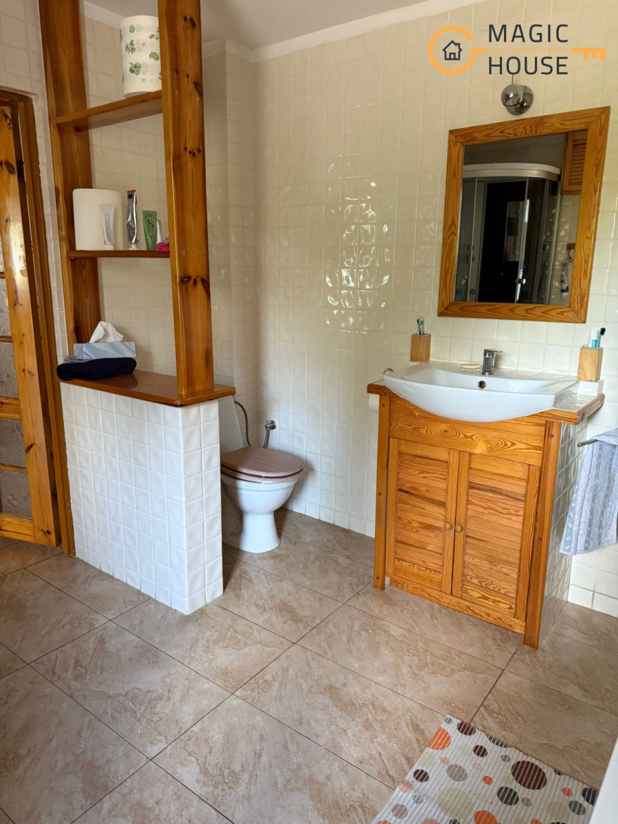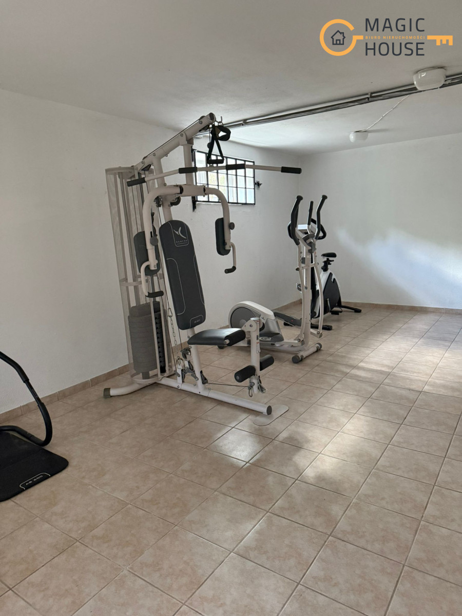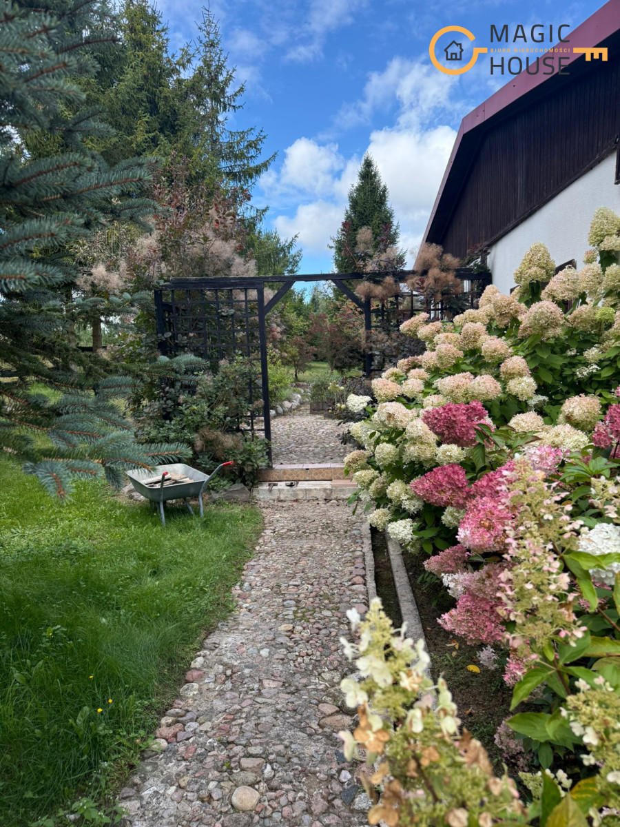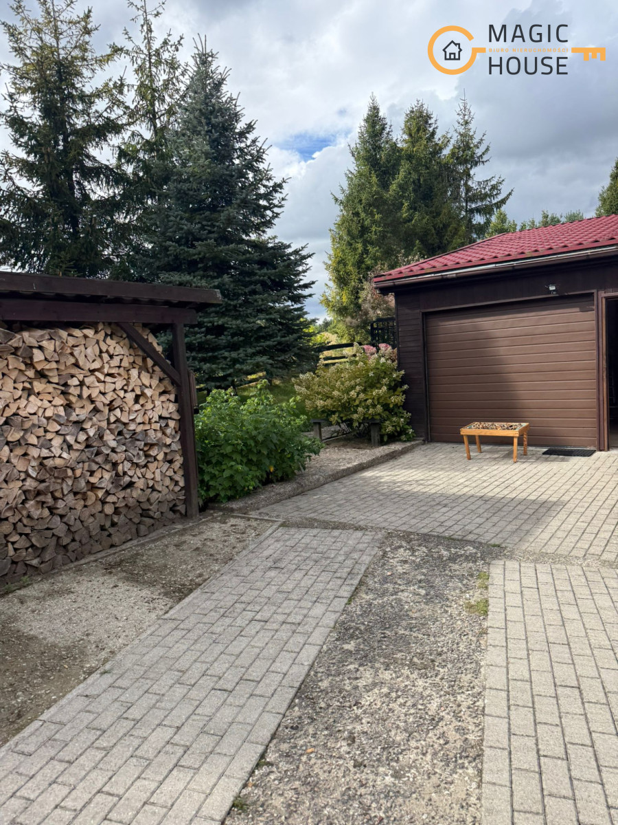 Rozległy teren posesji oferuje wszystko, czego można oczekiwać od prywatnej rezydencji. Znajduje się tu altana ogrodowa z bieżącą wodą i grillem, zarybione oczko wodne z kaskadą, prywatny las z czterema zagajnikami idealny na spacery i grzybobranie, sad owocowy oraz plantacja borówek i malin. Dla najmłodszych przygotowano plac zabaw z huśtawkami, trampoliną, domkiem i basenem, a miłośnicy prac ręcznych i majsterkowania docenią duży budynek gospodarczo-warsztatowy o powierzchni 300 m². Na terenie posesji znajduje się także wolnostojący garaż na dwa auta, trzy drewutnie, studnia głębinowa, woda z gminy oraz rozprowadzony system nawodnienia z ośmioma ujęciami.